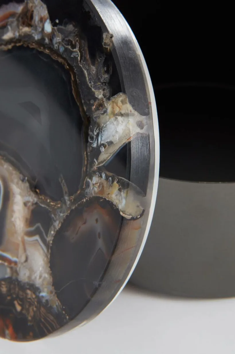 Elegant dekorationsask med lock. Locket är av agat som är en ädelsten med vackert, marmorerat mönster. Asken är av rostfritt stål.