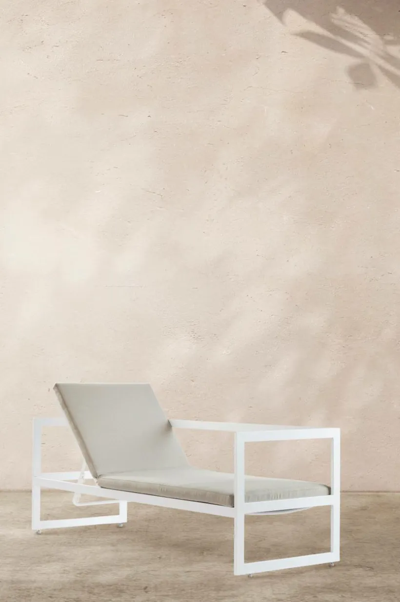 Solsäng eller utesoffa av pulverlackerad aluminium. Botten är av kraftig väv. Ryggdelen på solsängen är ställbar i 5 lägen. Madrassen har yttertyg av polyester med slubeffekt och foam av skumplastgummi. Får du bara plats med en möbel på balkongen så tipsar vi dig om att välja ALASSIO. En solsäng med ställbar rygg som också är en soffa för dina vänner. Dynan som hör till är snygg och bekväm. Denna varianten har ryggstödet till vänster när du ligger mot den ställbara delen.