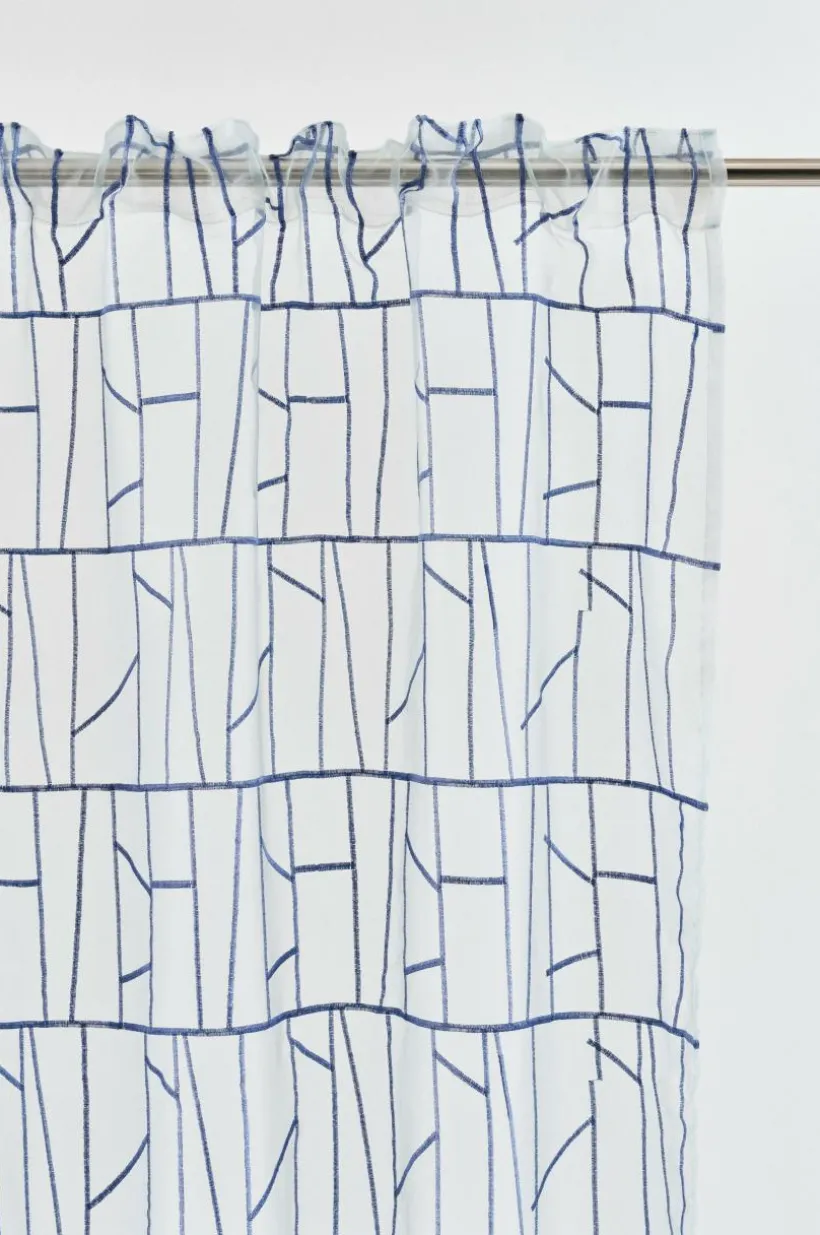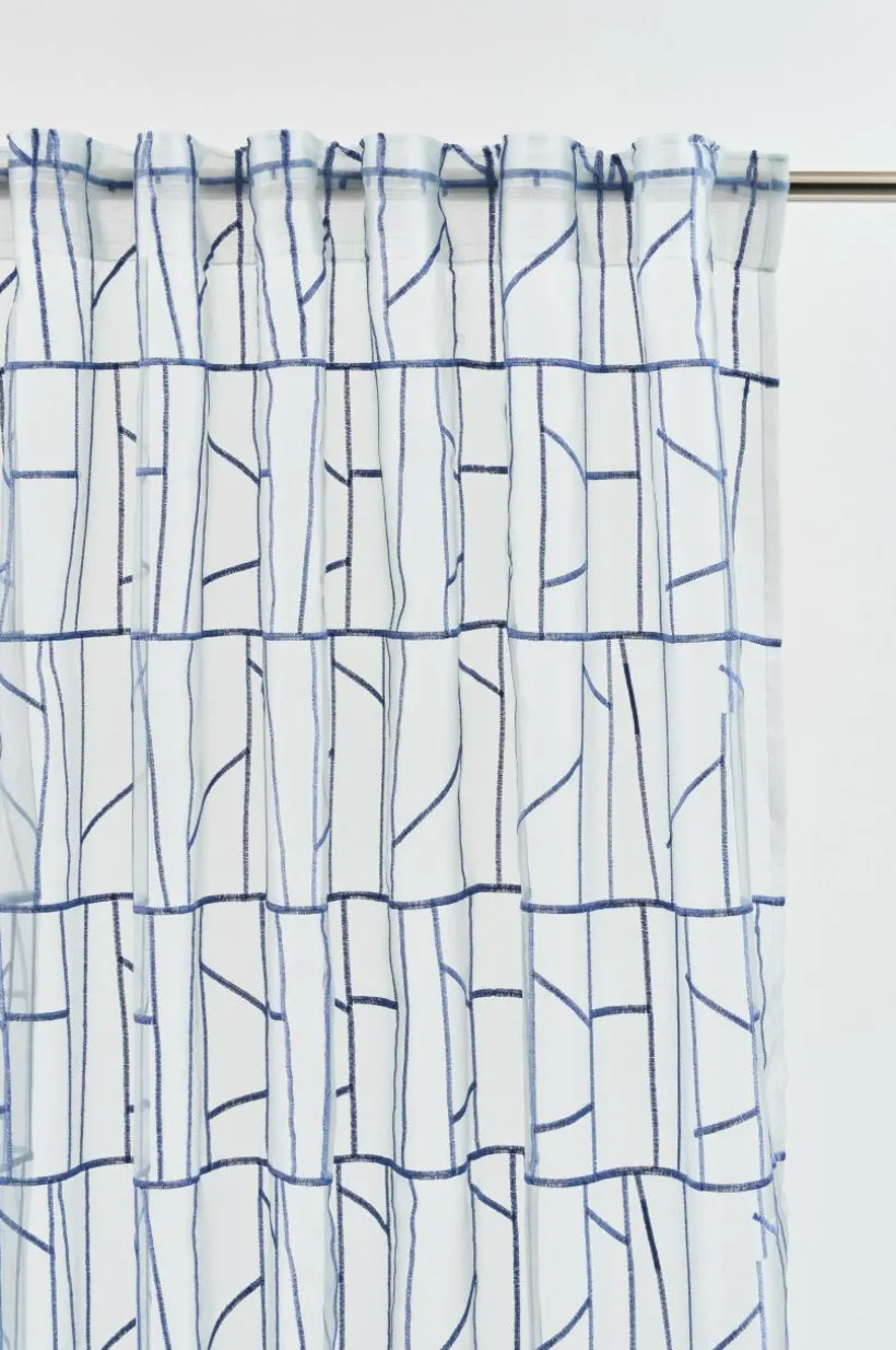 En gardinlängd i organza av polyester och polyamid med broderat, oregelbundet nätmönster. Mönstret har inspirerats av bojagi som är koreansk lappteknik. Den skira längden har påsytt multifunktionsband och kan hängas upp med fingerkrokar, kanal samt dold hälla.