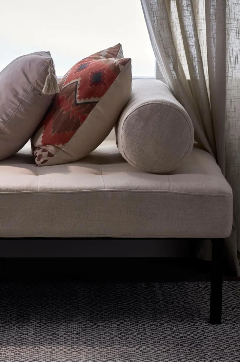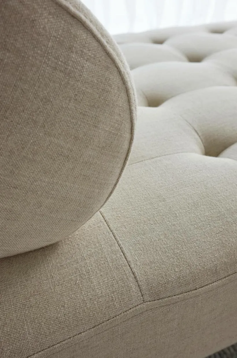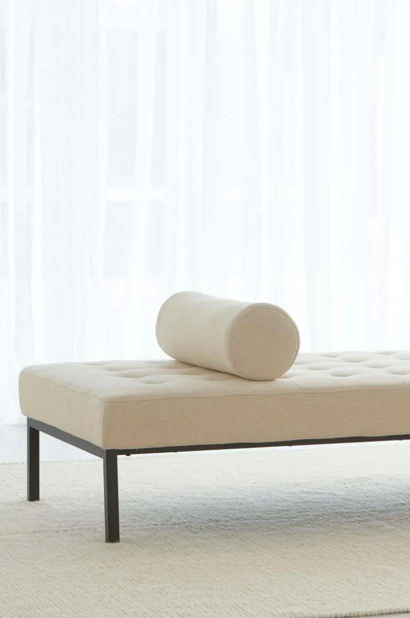 CARMEL dagbädd i linne ger med sin stilrena form i kombination med det vackra linnetyget, cylinderformade kudden och den djuphäftade sittdynan, ett extraordinärt intryck.CARMEL är underbar som komplement till en soffgrupp eller som ensam möbel i ett stort rum med bara en vacker matta och massor av härliga kuddar. Dagbädden är den ultimata lyxen. Den bjuder verkligen in till vila, så lägg dig ner och njut av lugnet.
