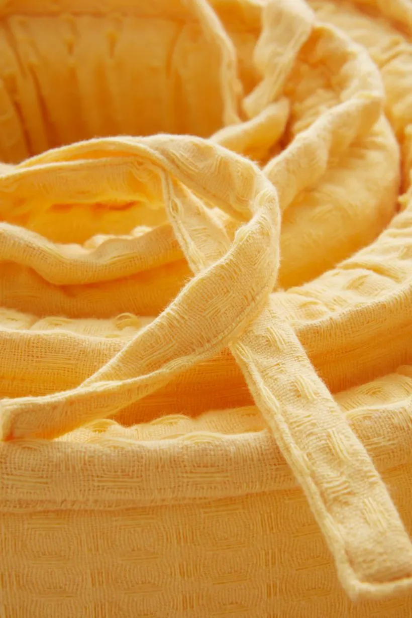 Spjälsängsskydd med yttertyg av ekologisk bomull i en mjuk och skön, våfflad kvalité. Tyget är plaggtvättat vilket innebär att det tvättats innan sömnad, och den våfflade kvalitén är extra mjuk och skön. Fyllning av polyester med mjuk skumgummikärna. Spjälskyddet gör spjälsängen mer ombonad och mysig, samtidigt som det hindrar barnet från att slå emot spjälorna i sömnen. Spjälsängsskyddet knyts fast med knytband. Yttertyget är avtagbart med dragkedja i öppningen och tvättbart. Spjälskyddet passar en spjälsäng med måtten 60×120 cm. Tygets gramvikt 230 g/m².