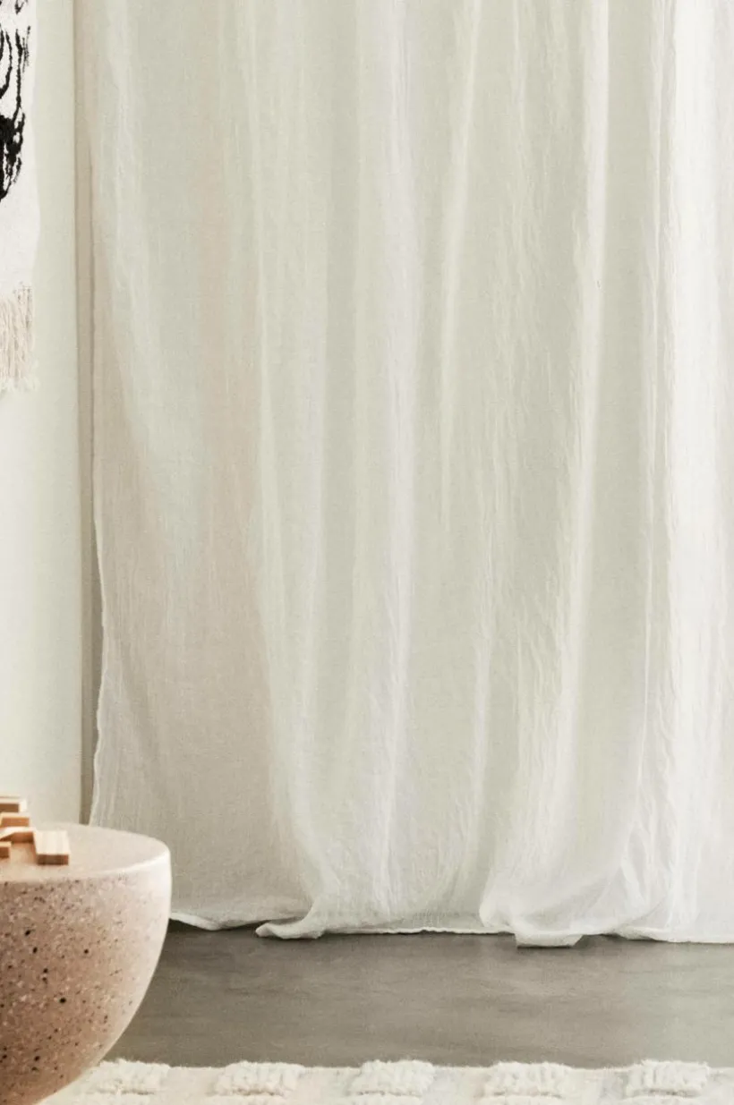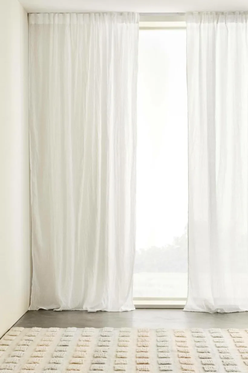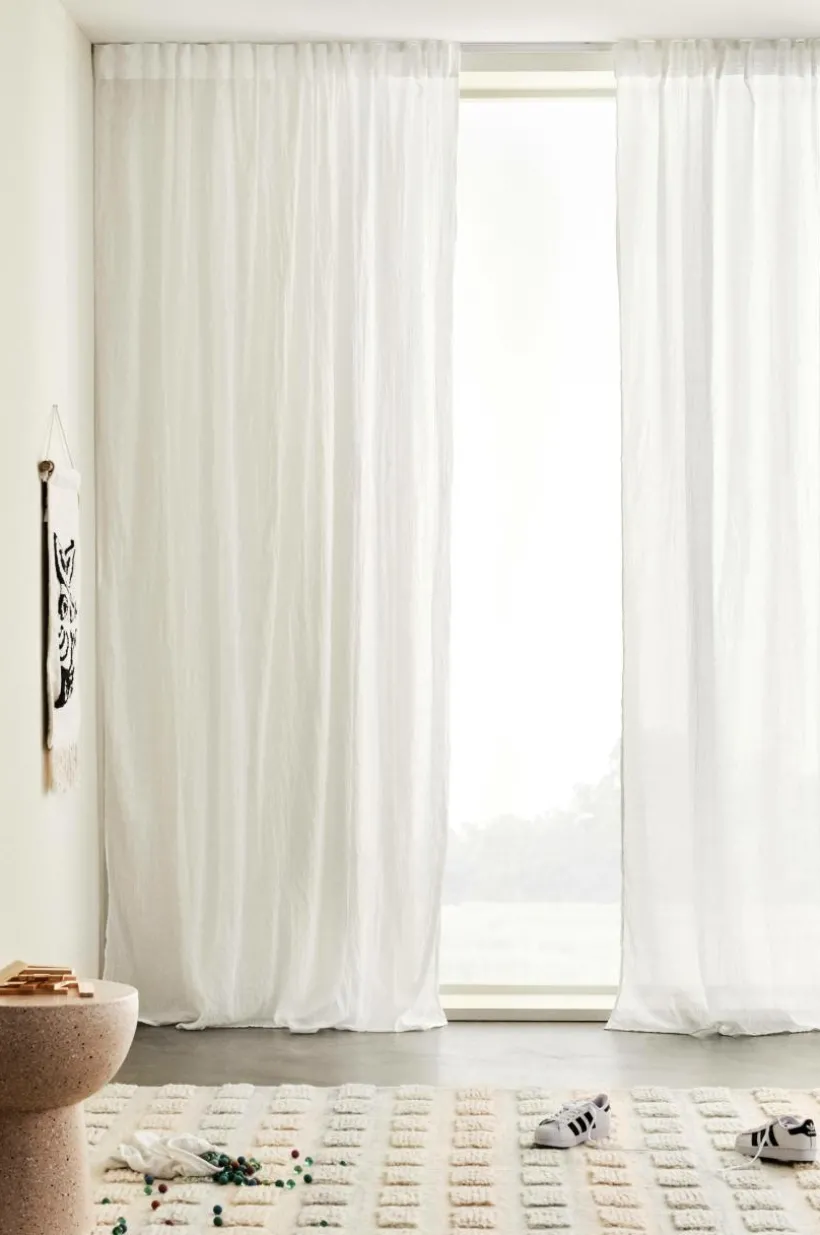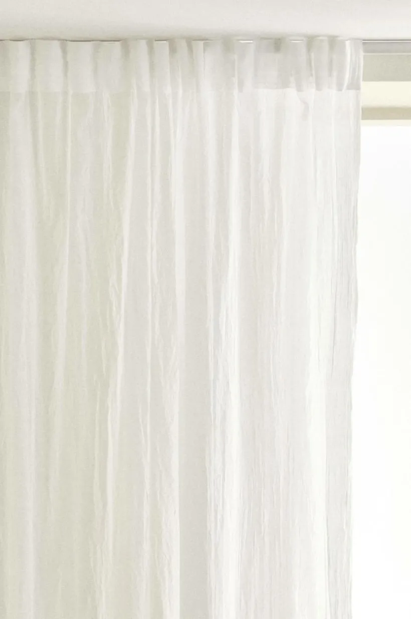 Två gardinlängder i mjuk bomullsblandning som ger ett fint fall. Påsytt multifunktionsband upptill gör att gardinen kan hängas upp med fingerkrokar, kanal samt dold hälla.