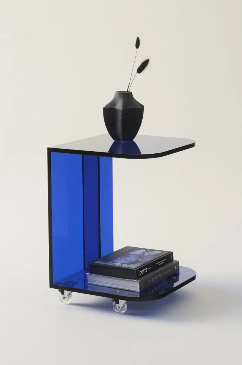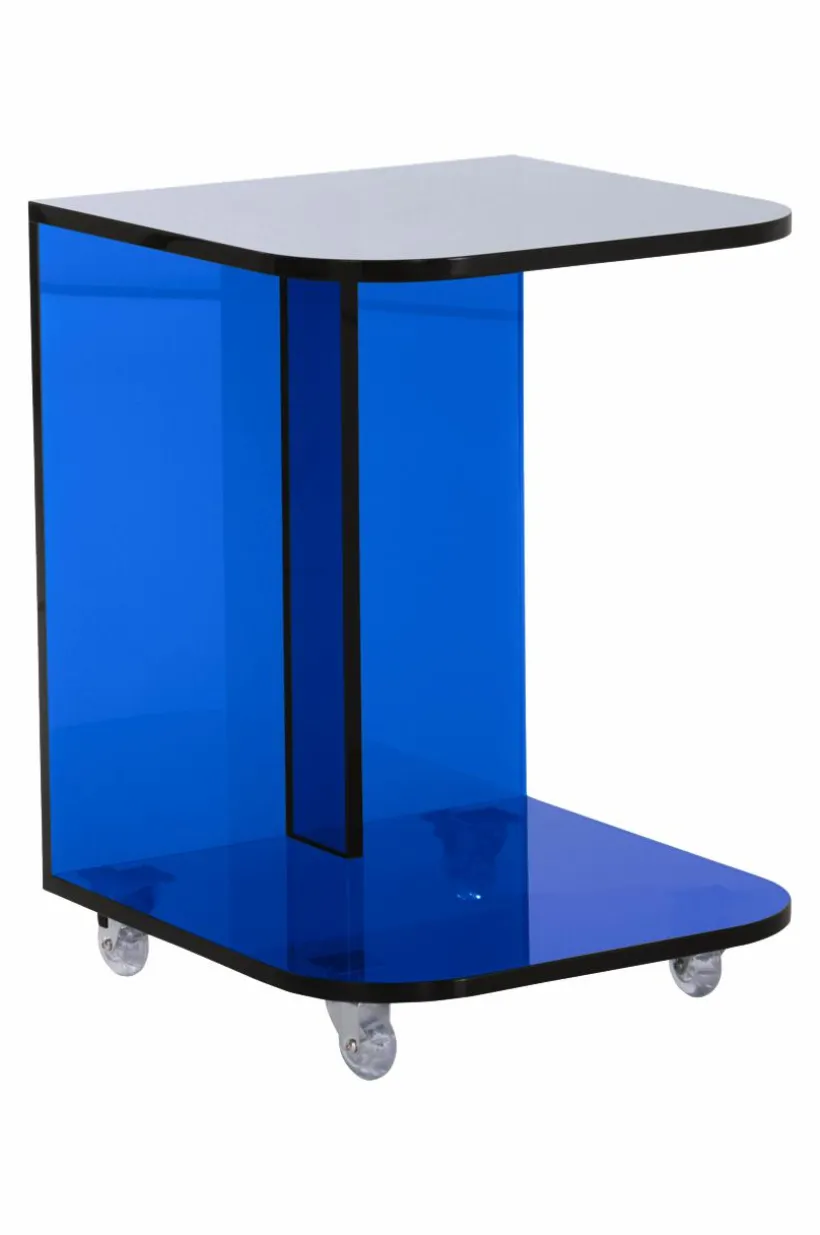 Sidobord av akrylglas. Sidobordet har enkel och ren form med med futuristiska känsla. Kanterna framtill är mjukt rundade och nedtill finns en hylla för förvaring av till exempel tidningar och böcker. De små hjulen under gör bordet enkelt att flytta. CLYDE har flexibel användning och passar som sidobord vid soffan eller varför inte som sängbord. Färgvalen är härligt uppfriskande.