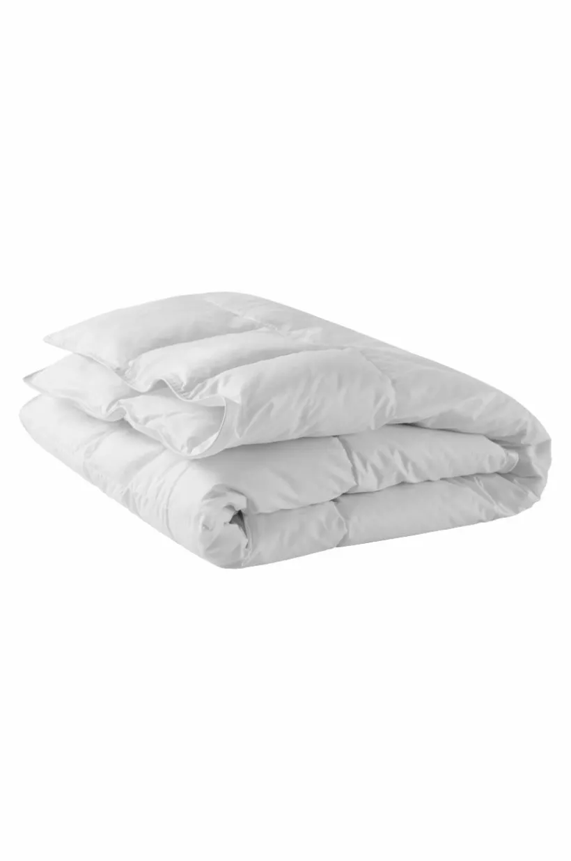 Barntäcke sval för spjälsäng eller juniorsäng. Yttertyget är i mjuk ekologisk bomull. Fyllning av dunimitation som ger en härlig känsla av dun, men har polyesterns fördelar som gör det lätt att hålla rent och fräscht. Täcket är rutquiltat och har sydda mellanväggar för att hålla fyllningen på plats. Täcket är förkrympt och krymper därför inte i tvätten. Det levereras i en praktisk tygväska. Vikt fyllning 300 g.