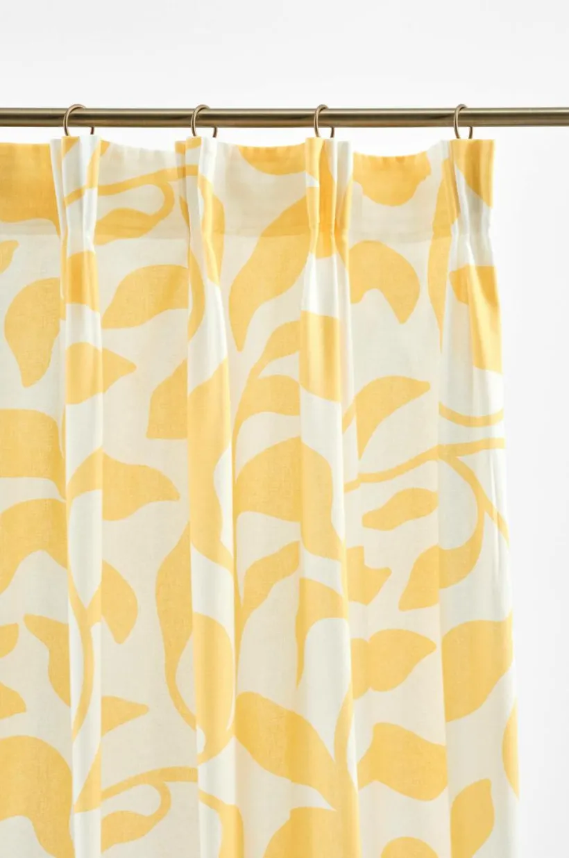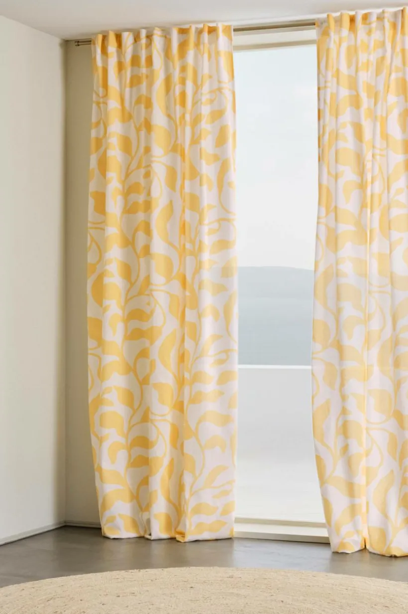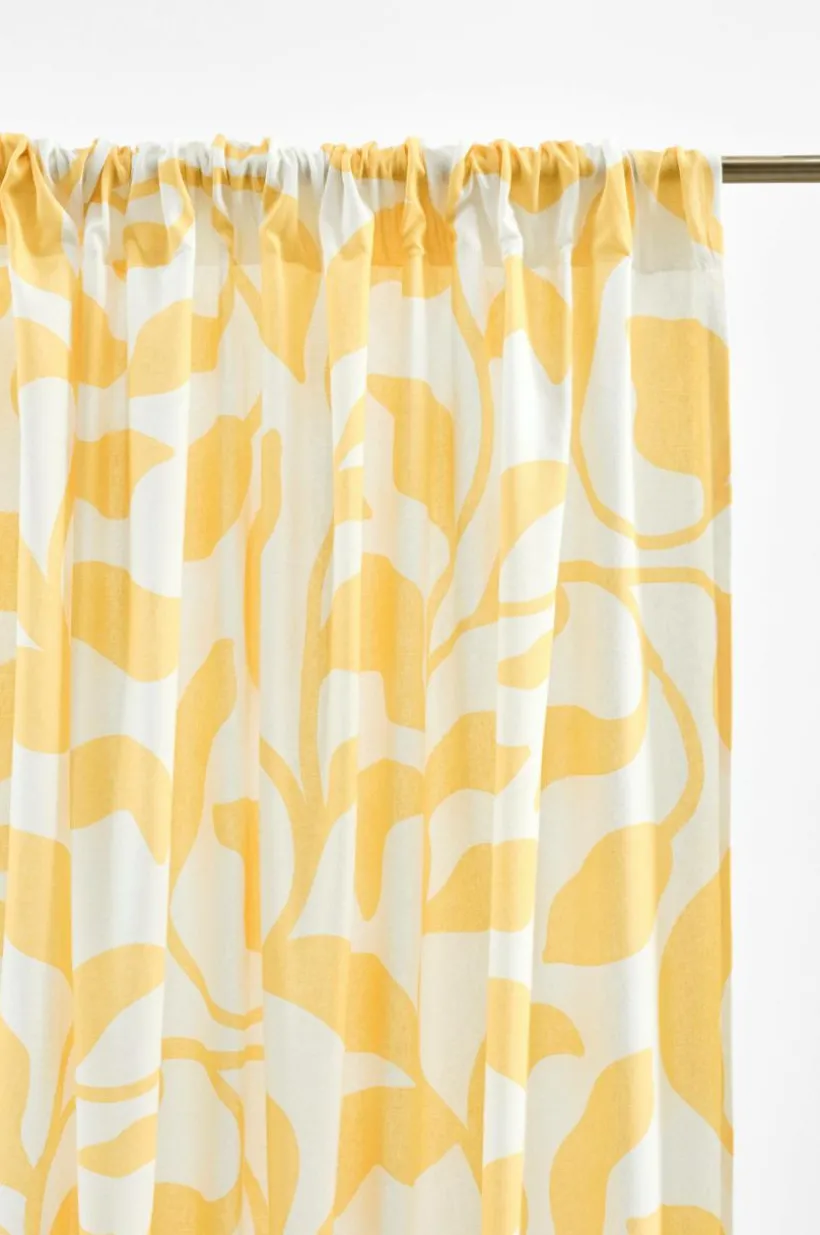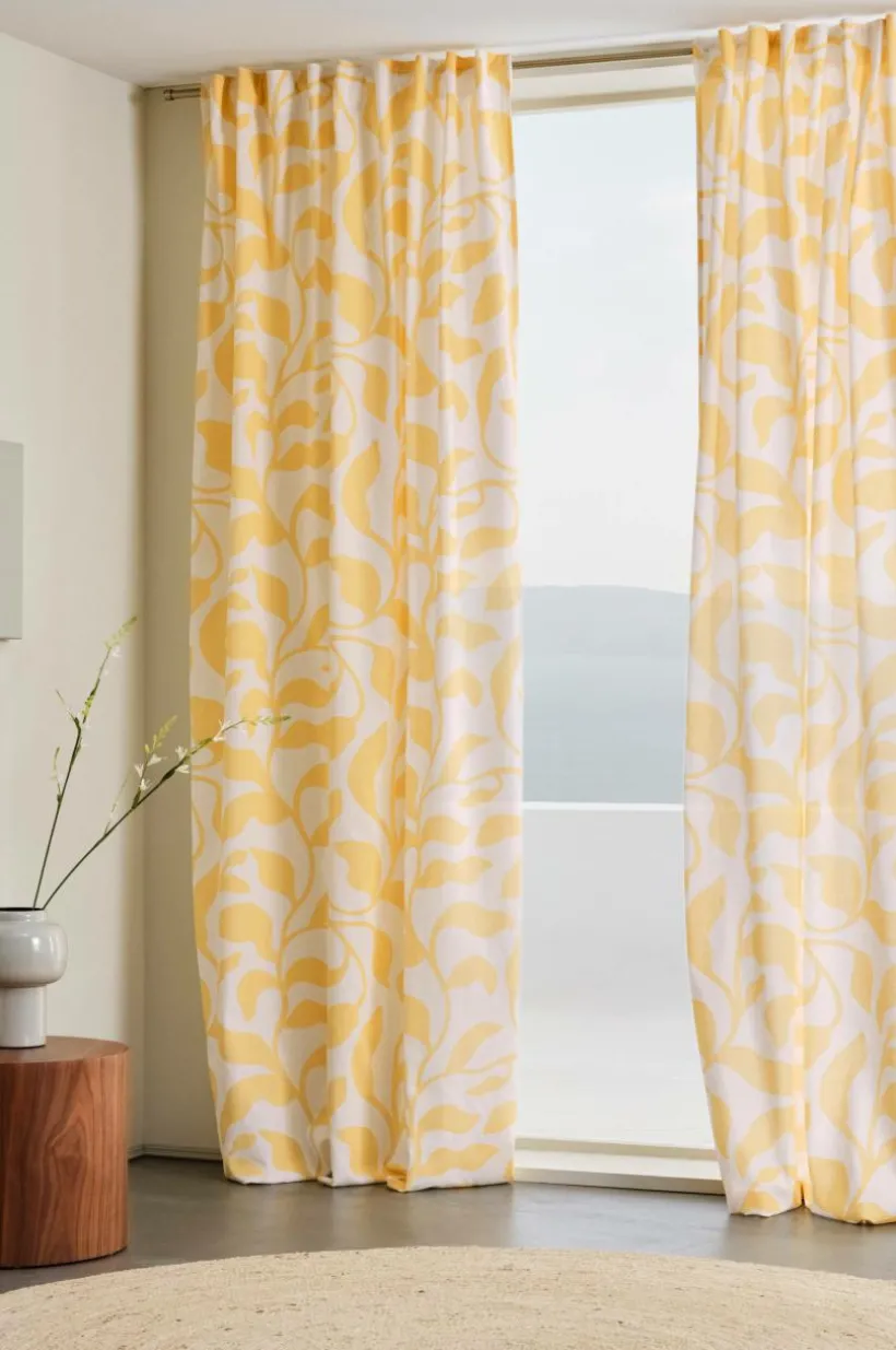 Två gardinlängder i halvpanama av bomull. Delarna i programmet DELLA har charmigt bladmönster i somrig färg tryckt på vit botten. DELLA har påsytt multifunktionsband och gardinen kan hängas upp med fingerkrokar, kanal samt dold hälla. Tygets gramvikt 170 g/m².