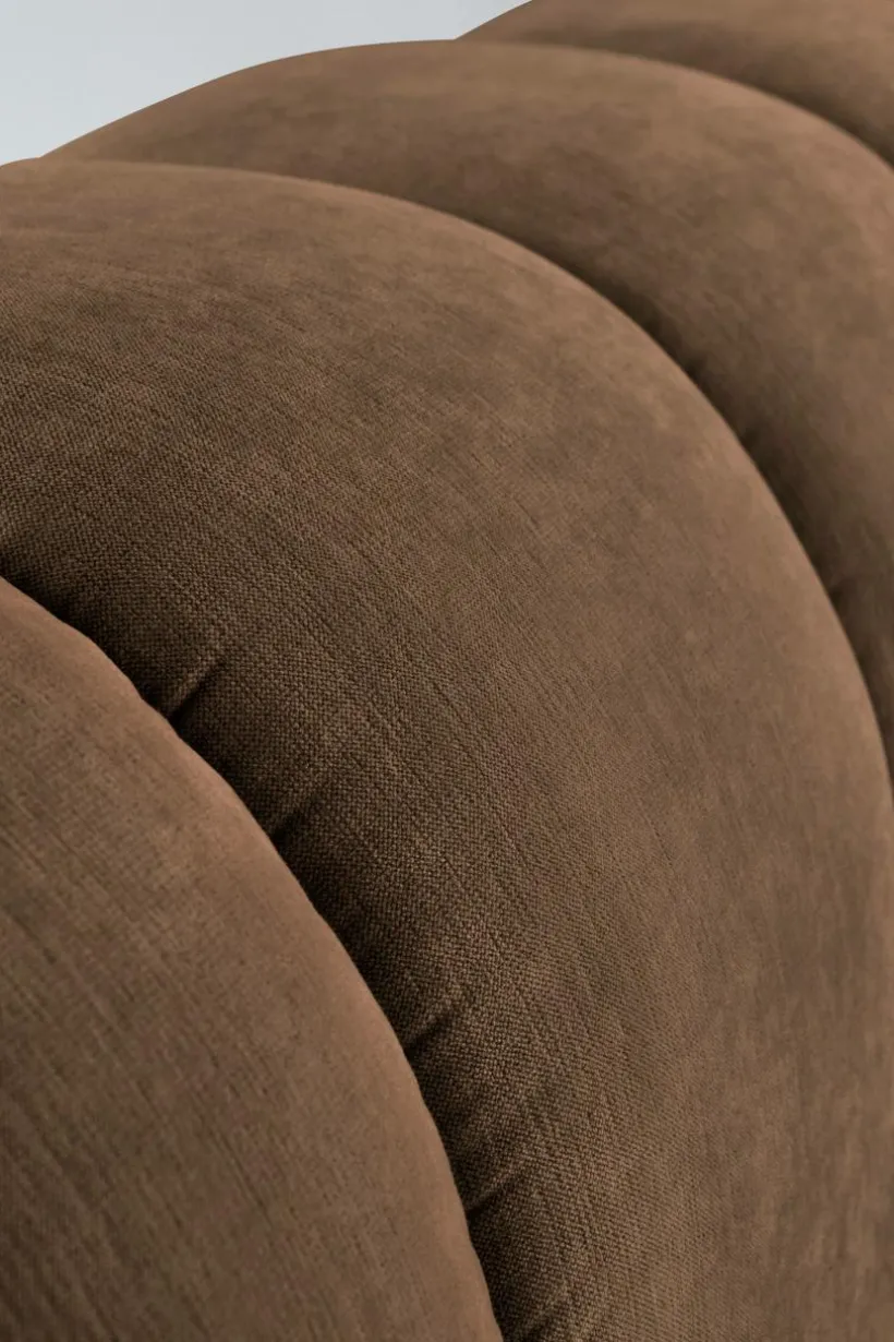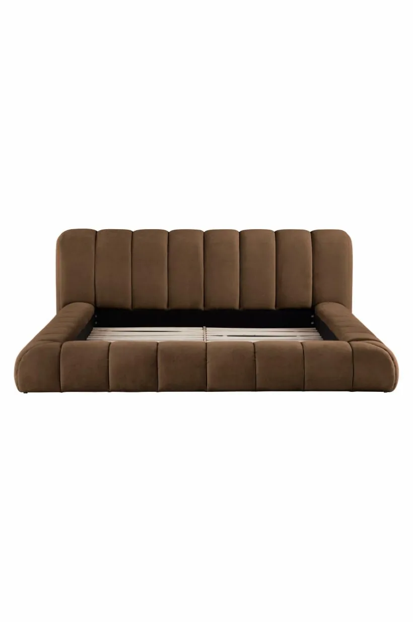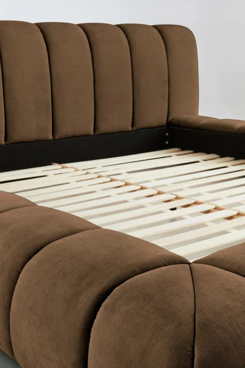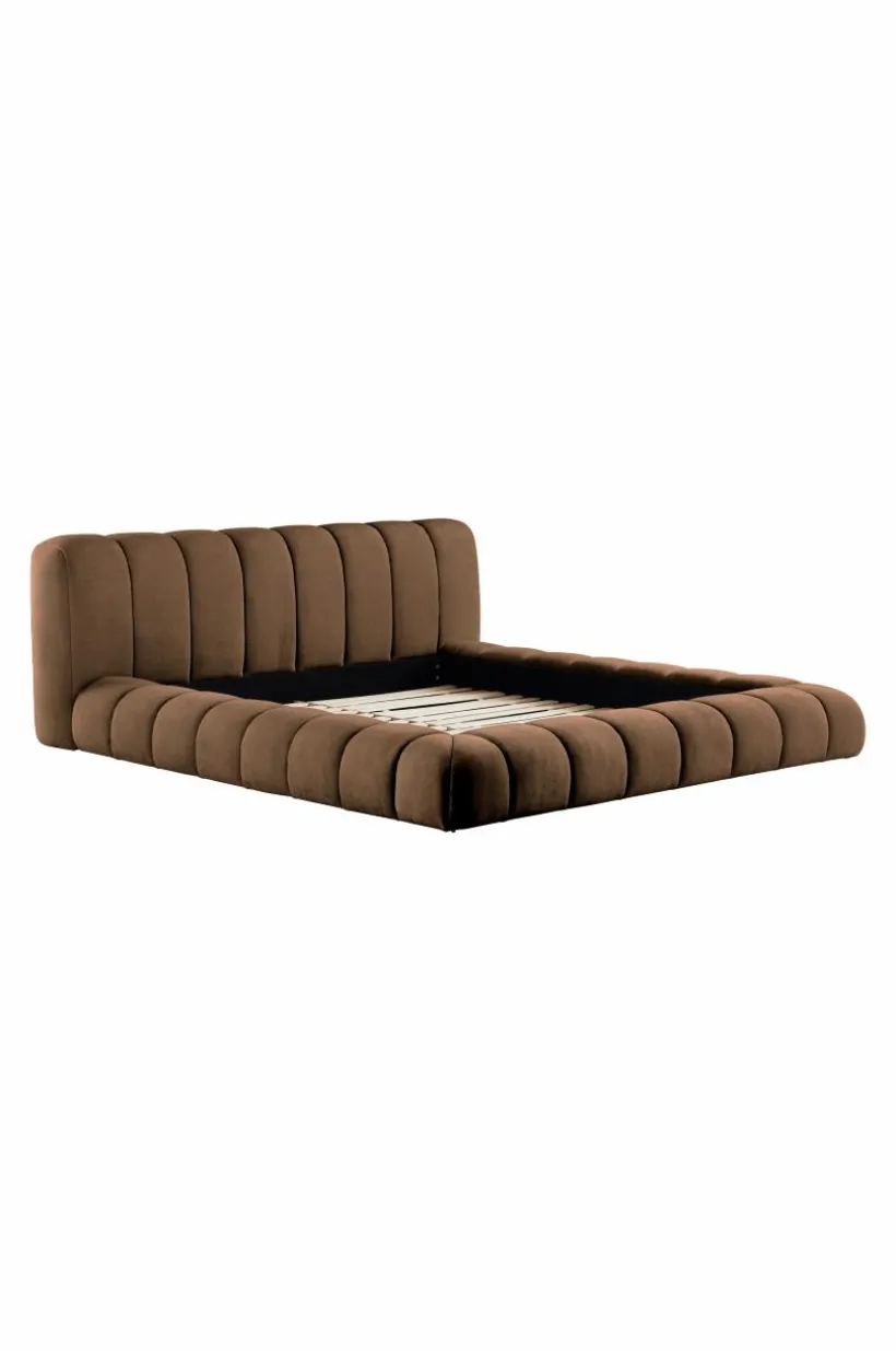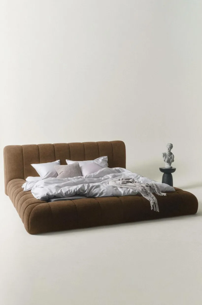 Sängram som är mjuk och rund i formen, mycket generös och inbjudande. Både huvudgaveln och ramen runt om är mjukt vadderad och klädd med ett neutralt och lättmatchat, enfärgat polyestertyg, lodräta sömmar gör sängen riktigt snygg. Ramen runt sängen går nästan ända ned till golvet, bara en liten luftspalt lämnas som gör att luften kan cirkulera under sängen. Stommen är tillverkad av FSC-certifierad furu och plywood. Sängramen har ribbotten av furu och du kompletterar med madrasser eller resårmadrasser beroende på vilket du föredrar. Madrass/resårmadrass ingår ej.