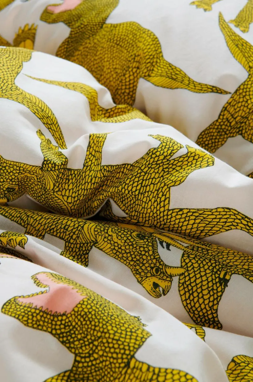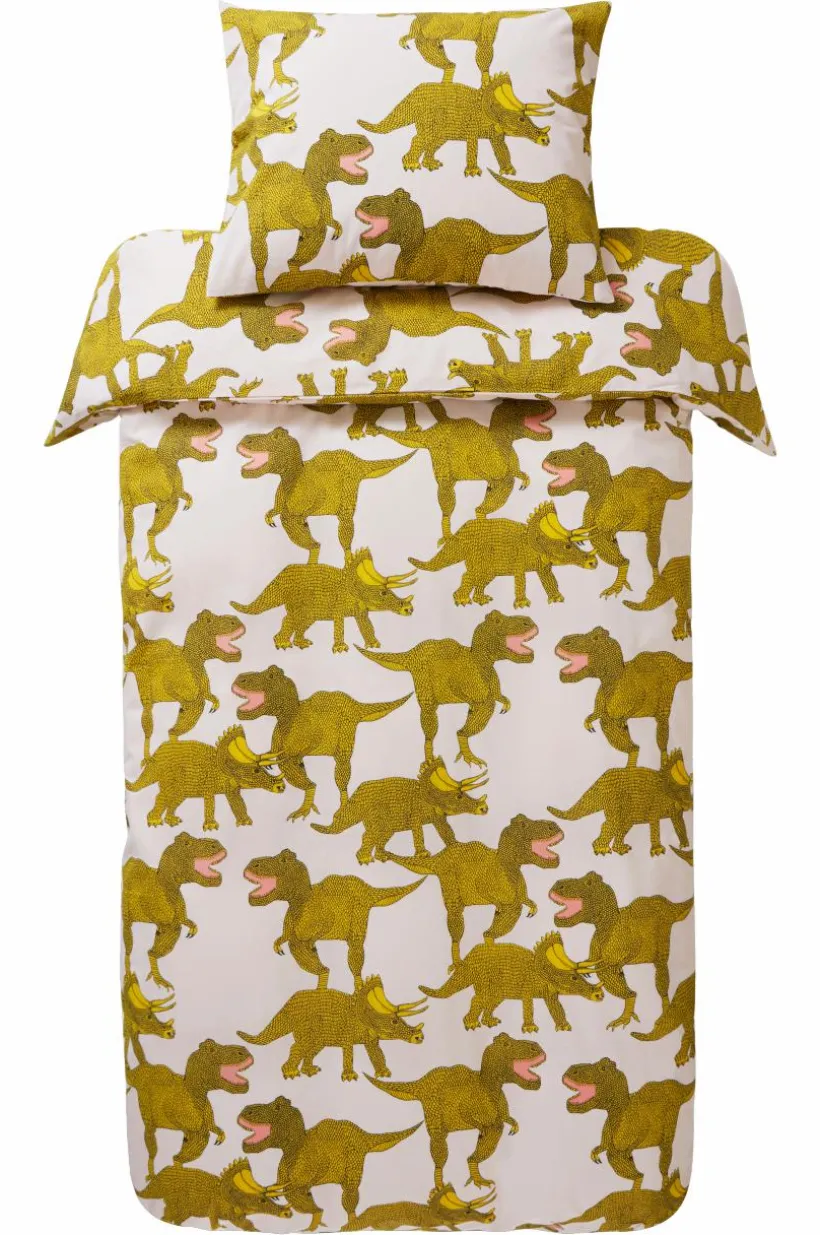 Påslakanset i 2 delar av mjuk, ekologisk bomull med tryckt mönster i motiv av söta små dinosaurier. Att bädda med bomull är luftigt och mjukt mot kroppen. Trådtäthet på 144 tc. (Trådtätheten talar om antalet trådar, thread counts, per kvadrattum i ett tyg. Ju högre trådtäthet desto högre kvalité).