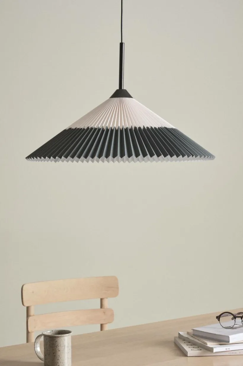 Taklampa med veckad textilskärm och metalldetaljer med matt finish. Skärmen är snyggt färgad med lätt batikkänsla i färgningen. Takkopp av metall med krokupphänge. Svart sladd. Lampan är jordad, klass 1. På grund av EU-regler behövs en separat takkontakt i vissa länder. Takkontakten ska vara jordad (klass 1) och köps separat.