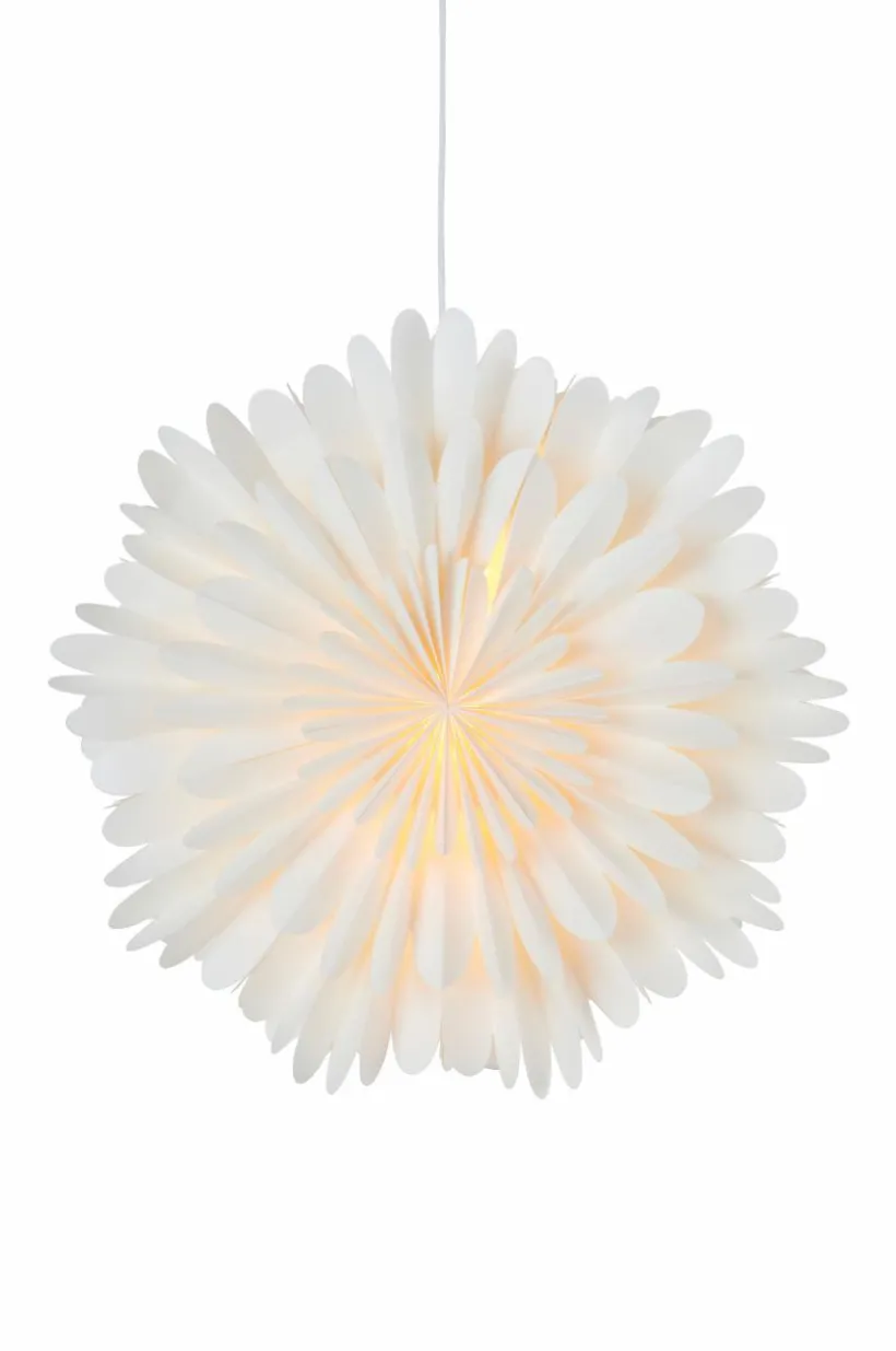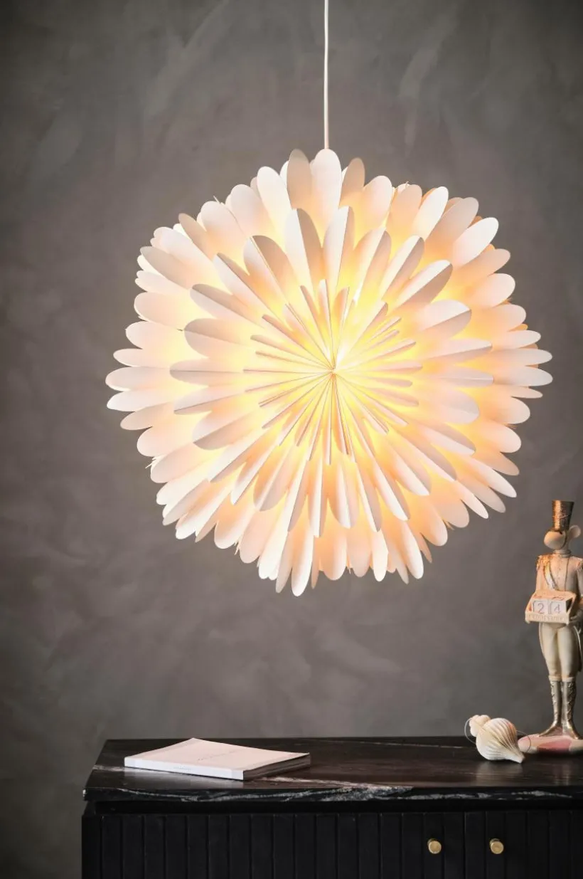 EIRA julstjärna förvandlar ditt vardagsrum med en touch av vintermagi. Denna utsökta stjärna är formad som en snöflinga/blomma och ger ett förtrollande sken. Förpackad i en robust vit låda levereras den komplett med lamphållare, glödlampsskydd och enkla monteringsanvisningar. Med en generös diameter på 68 cm skapar EIRA-stjärnan en festlig atmosfär som fängslar och förtrollar. Den är perfekt som säsongsbelysning och ger inredningen en modern och trendig touch.