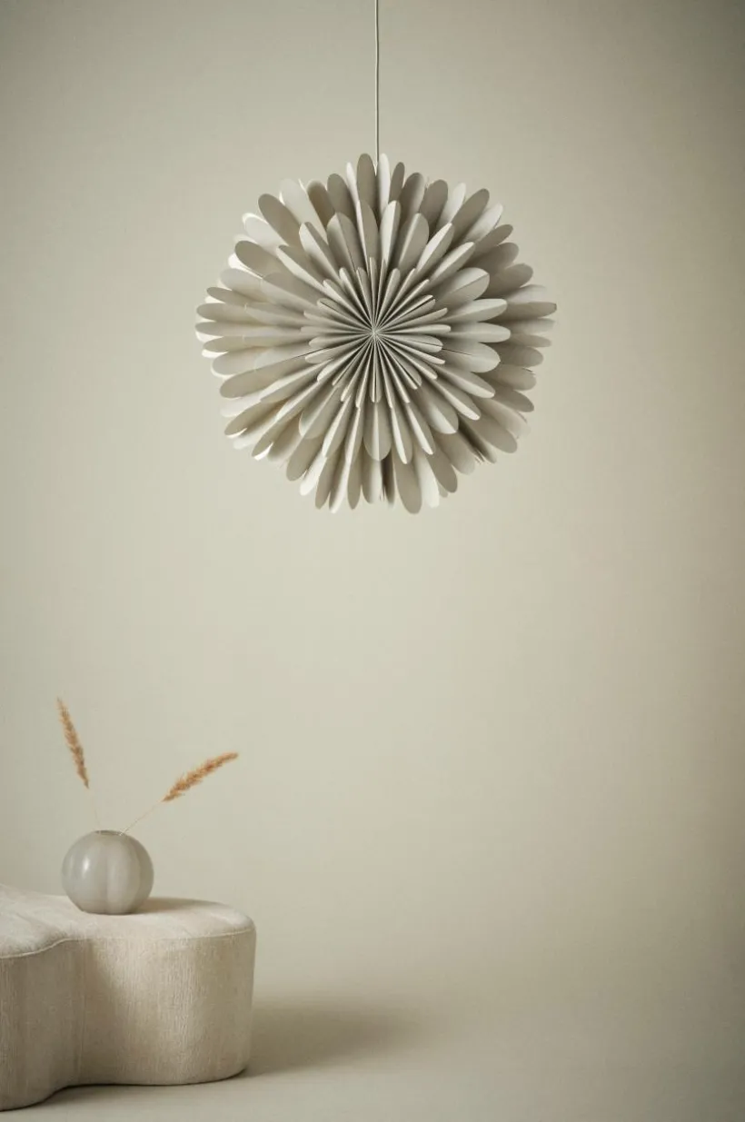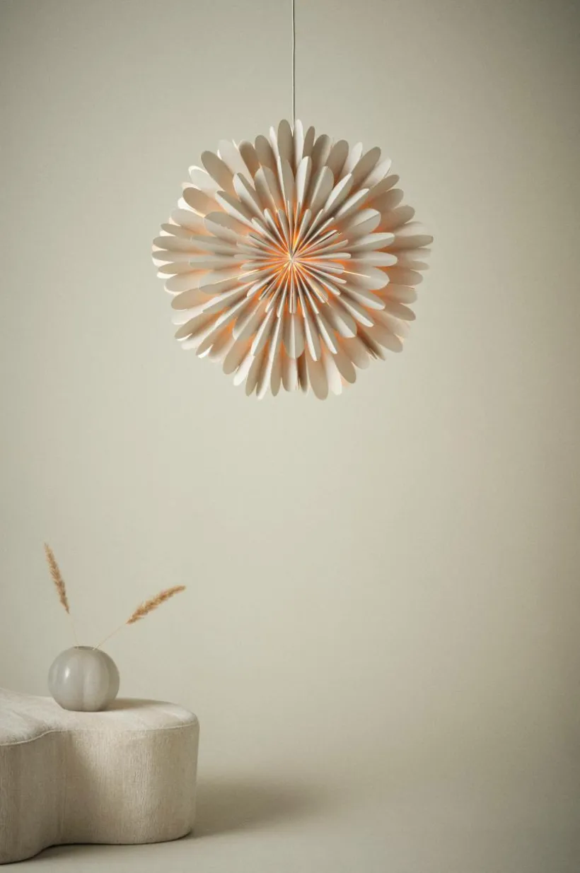 EIRA julstjärna förvandlar ditt vardagsrum med en touch av vintermagi. Denna utsökta stjärna är formad som en snöflinga/blomma och ger ett förtrollande sken. Förpackad i en robust vit låda levereras den komplett med lamphållare, glödlampsskydd och enkla monteringsanvisningar. Med en generös diameter på 68 cm skapar EIRA-stjärnan en festlig atmosfär som fängslar och förtrollar. Den är perfekt som säsongsbelysning och ger inredningen en modern och trendig touch.
