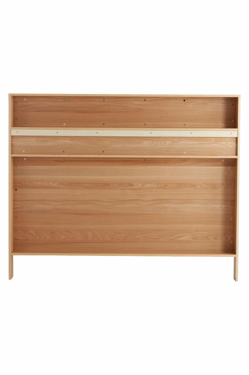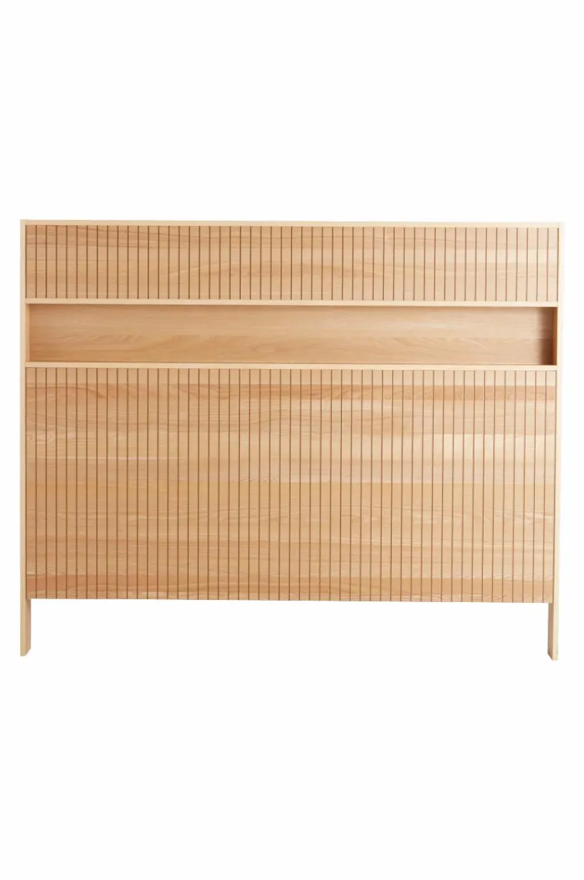 Sänggavel av askfaner med urfrästa spår som ger känslan av ribbor, intrycket du får är en mix av trä och retro. Sänggaveln är djup och har ett praktiskt fack där du kan förvara din bok, mobiltelefon eller ett glas vatten. Sänggaveln är fristående och placeras mellan sängen och väggen. Väggfäste medföljer.