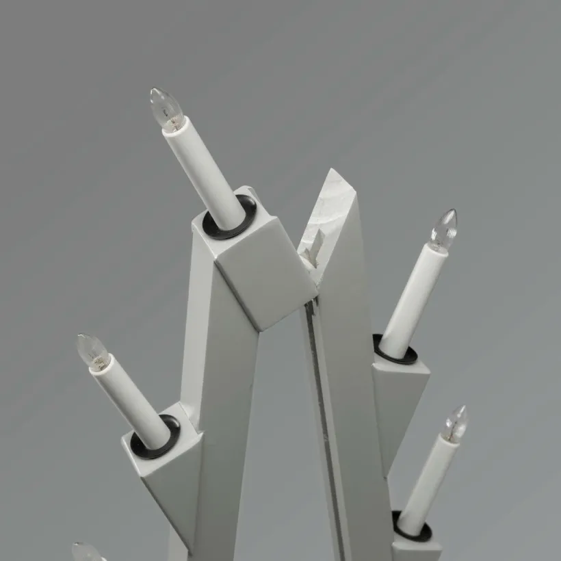 En 11-armad elljusstake i vitlackerat trä och mässingsfärgade deko ringar 230V. Vikbar med varmvita lampor. Anslutningssladd på 1,7 meter med sladdströmbrytare för manuell avstängning/påslagning. Höjd 82 cm och bredd 86 cm.