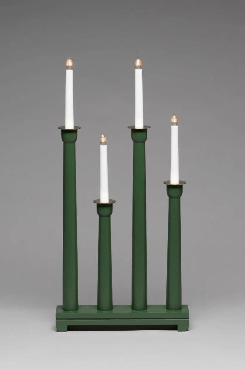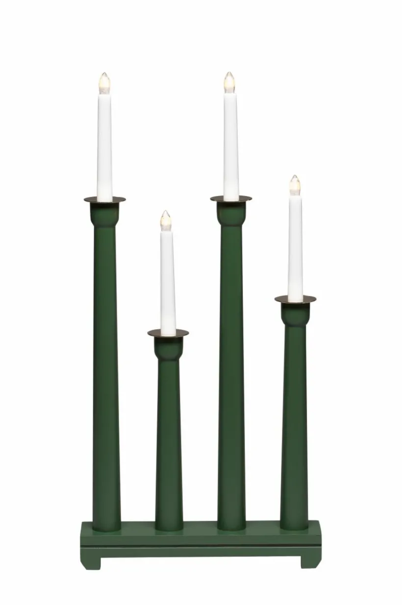 En 4 armad elljusstake i lackerat trä med dekorationsringar 230V. Varmvita lampor. Anslutningssladd på 1,7 meter med sladdströmbrytare för manuell avstängning/påslagning. Höjd 59 cm och bredd 29 cm.