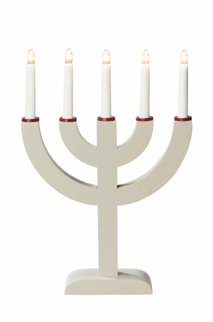 En 5 armad elljusstake i lackerat trä. Varmvita lampor.Anslutningssladd på 1,7 meter med sladdströmbrytare för manuell avstängning/påslagning. Höjd 41,7 cm och bredd 29 cm.