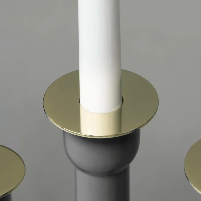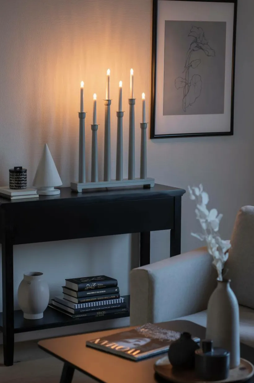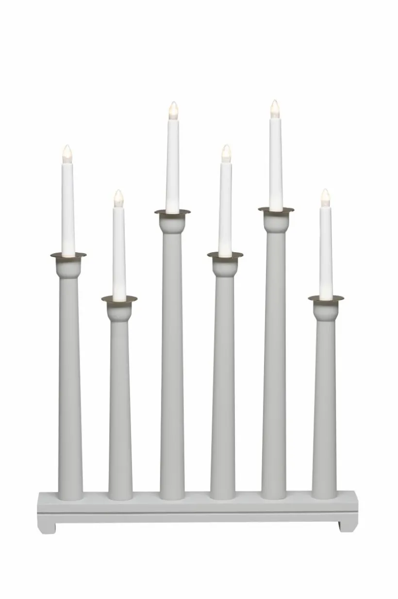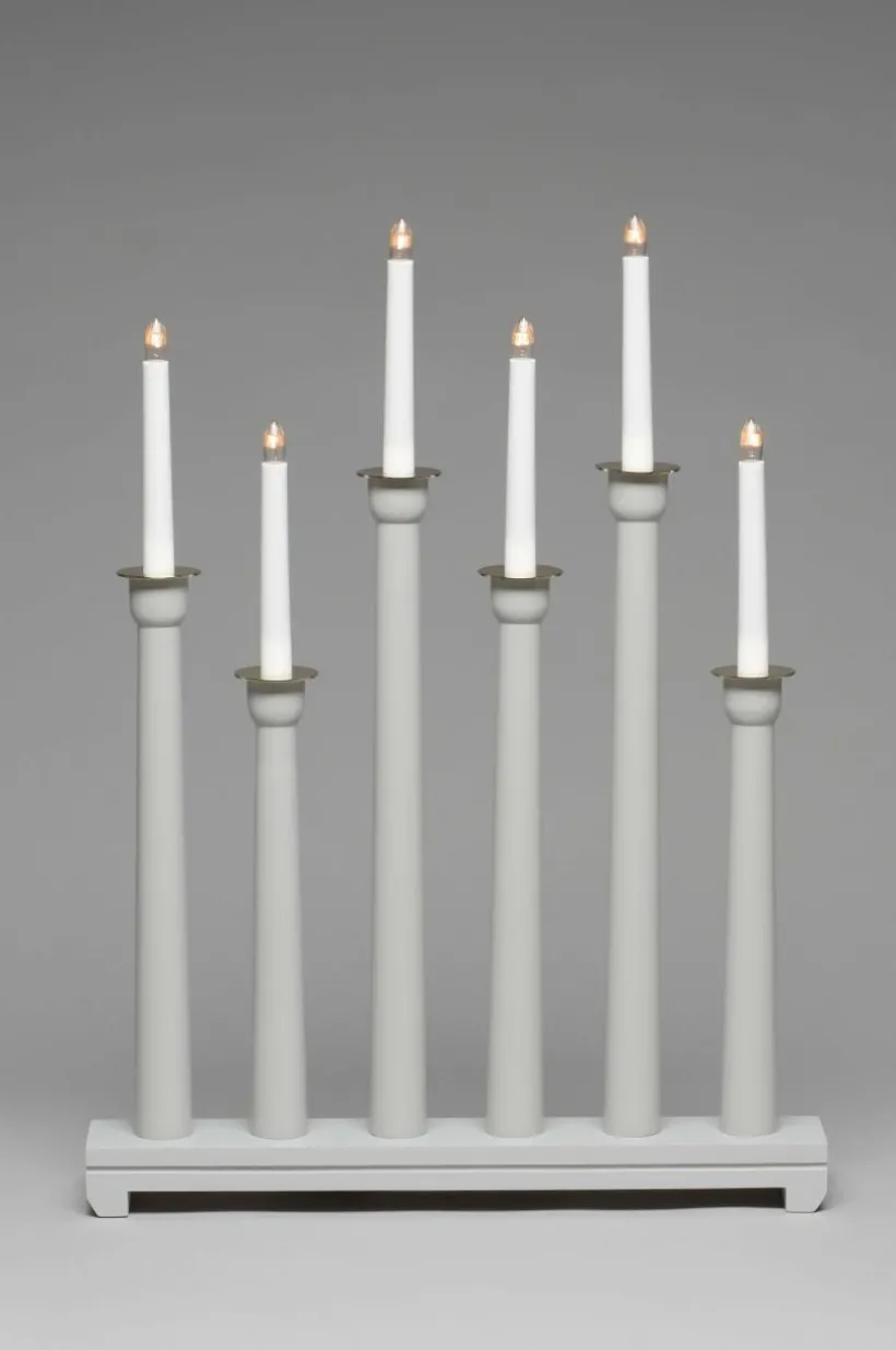 En 6 armad elljusstake i lackerat trä med dekorationsringar 230V. Varmvita lampor. Anslutningssladd på 1,7 meter med sladdströmbrytare för manuell avstängning/påslagning. Höjd 59 cm och bredd 44 cm.