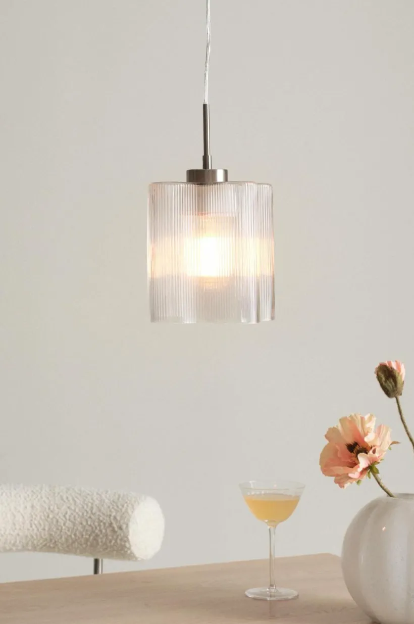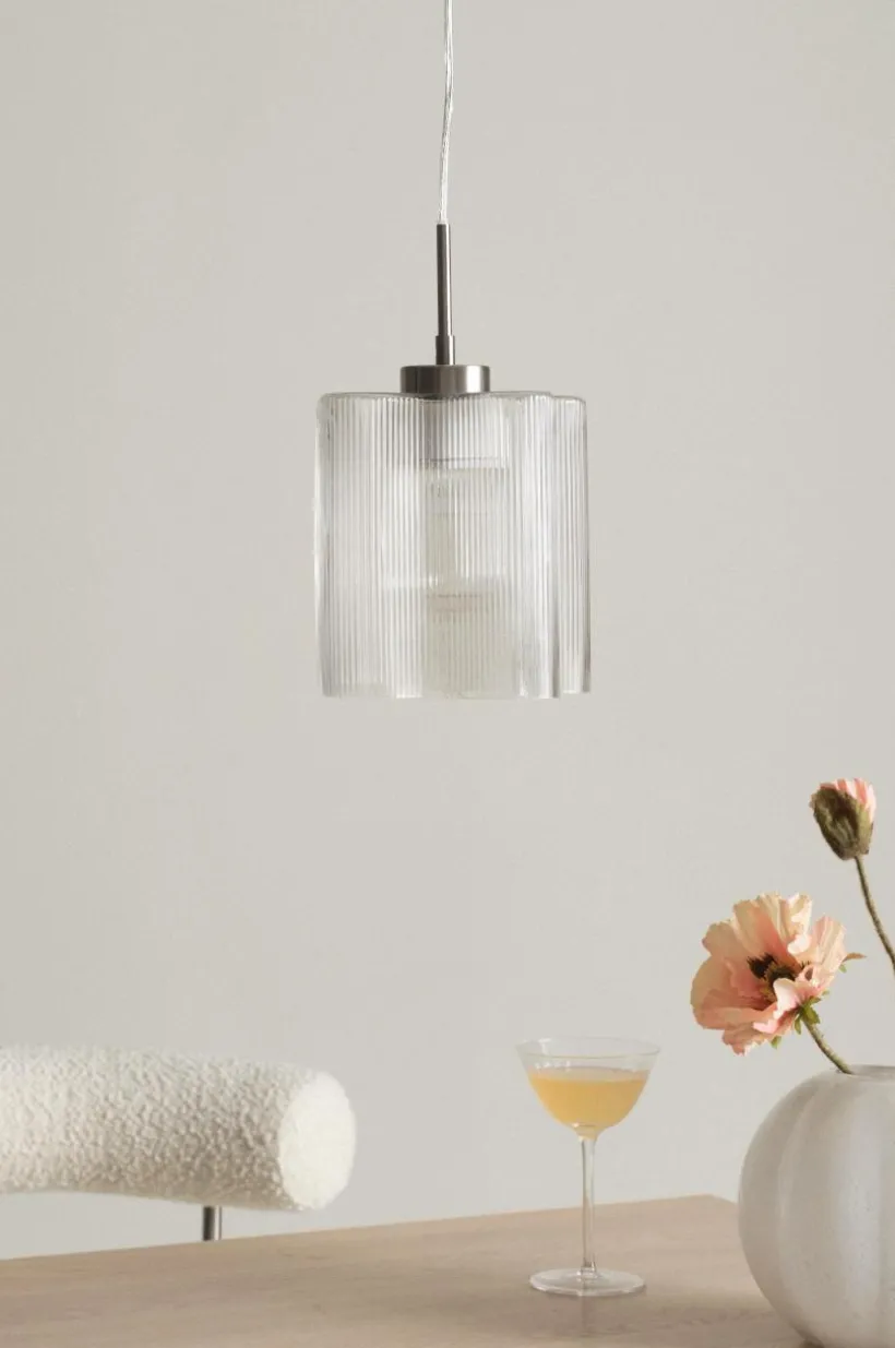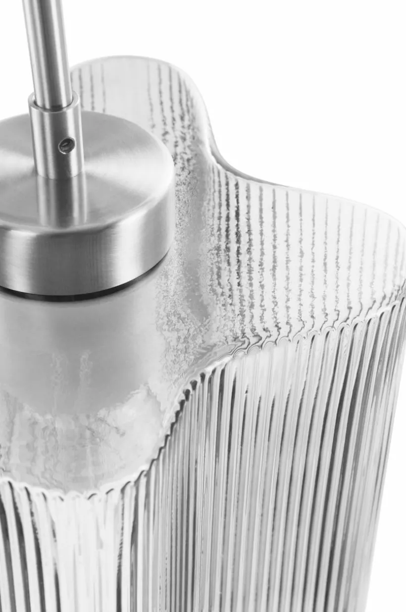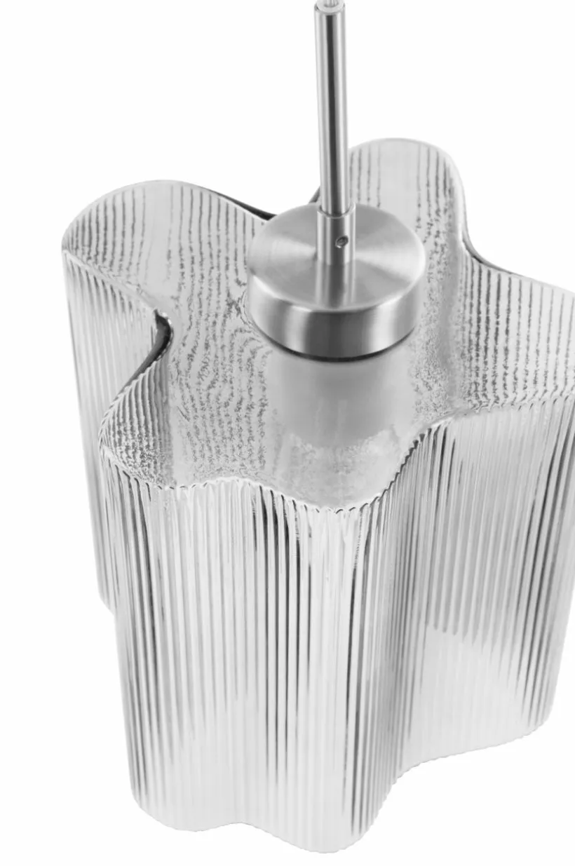 Taklampa av glas och formen är som en blomma, när naturen får inspirera blir det fint. Lampan har nedåtriktat ljus kombinerat med belysning genom glaset. Glaset har strukturränder som dämpar ljuset och ger vackert sken. EUROPA är mycket dekorativ över ett matbord, eller varför inte två eller tre på rad om matbordet är lite längre? Lampans fäste är av metall och sladden är transparent.