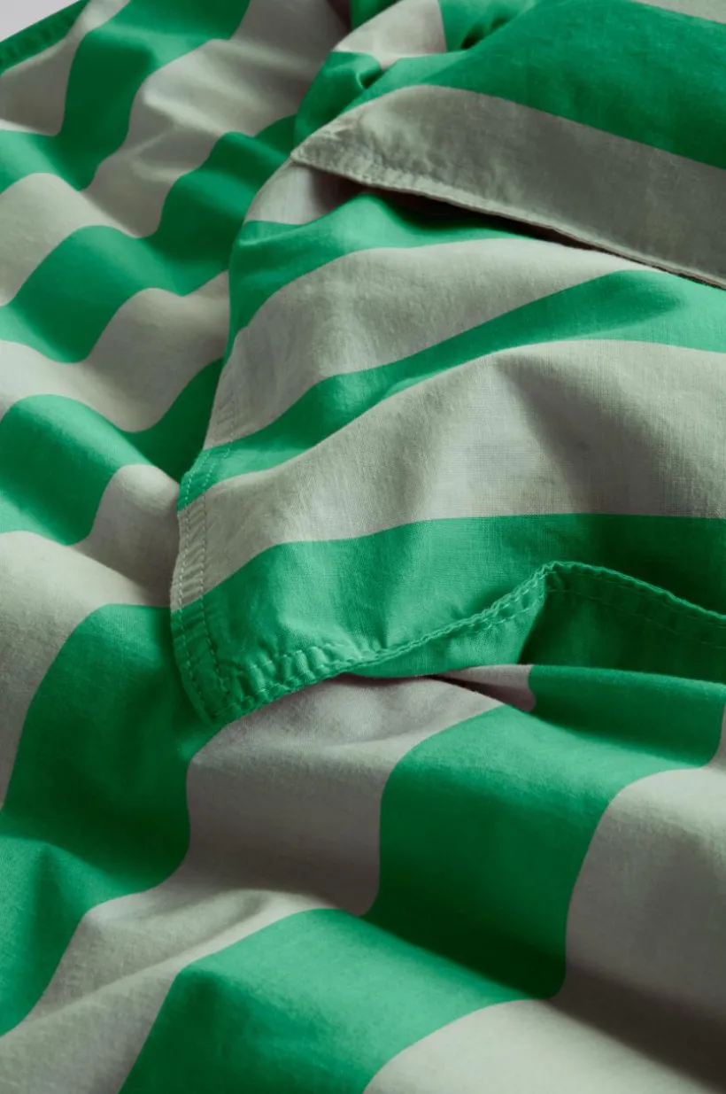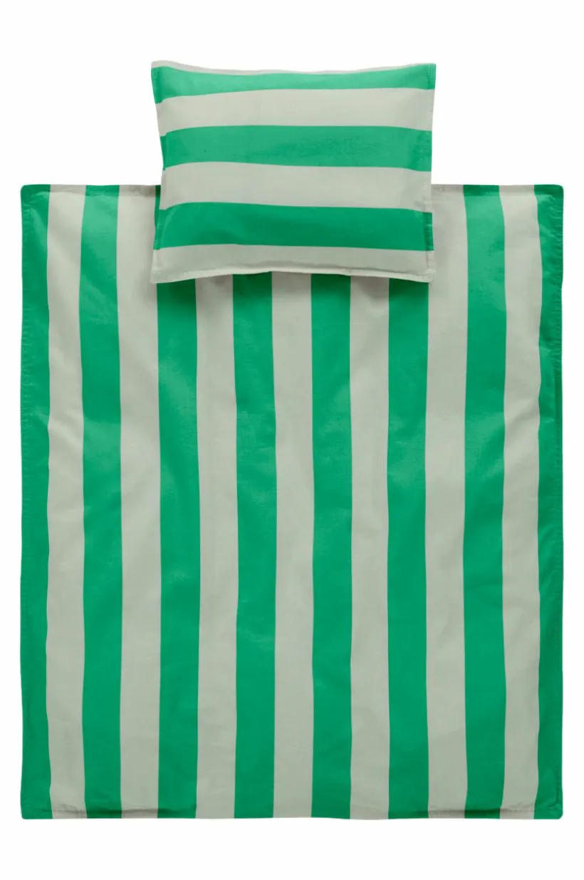 Påslakanset i två delar av ekologisk bomull. Setet passar till barnvagn och vagga. Blockrandigt mönstertryck är alltid fräscht, även till de minsta, och att sova i ekologisk bomull känns svalt och skönt mot huden.Setet som innehåller ett påslakan och ett örngott är dessutom plaggtvättat vilket innebär att det tvättats efter sömnad och känslan blir extra mjuk och skön. Dubbelsöm runt om örngott och påslakan ger exklusiv känsla. Trådtäthet på 144 tc. (Trådtätheten talar om antalet trådar, thread counts, per kvadrattum i ett tyg. Ju högre trådtäthet desto högre kvalité).