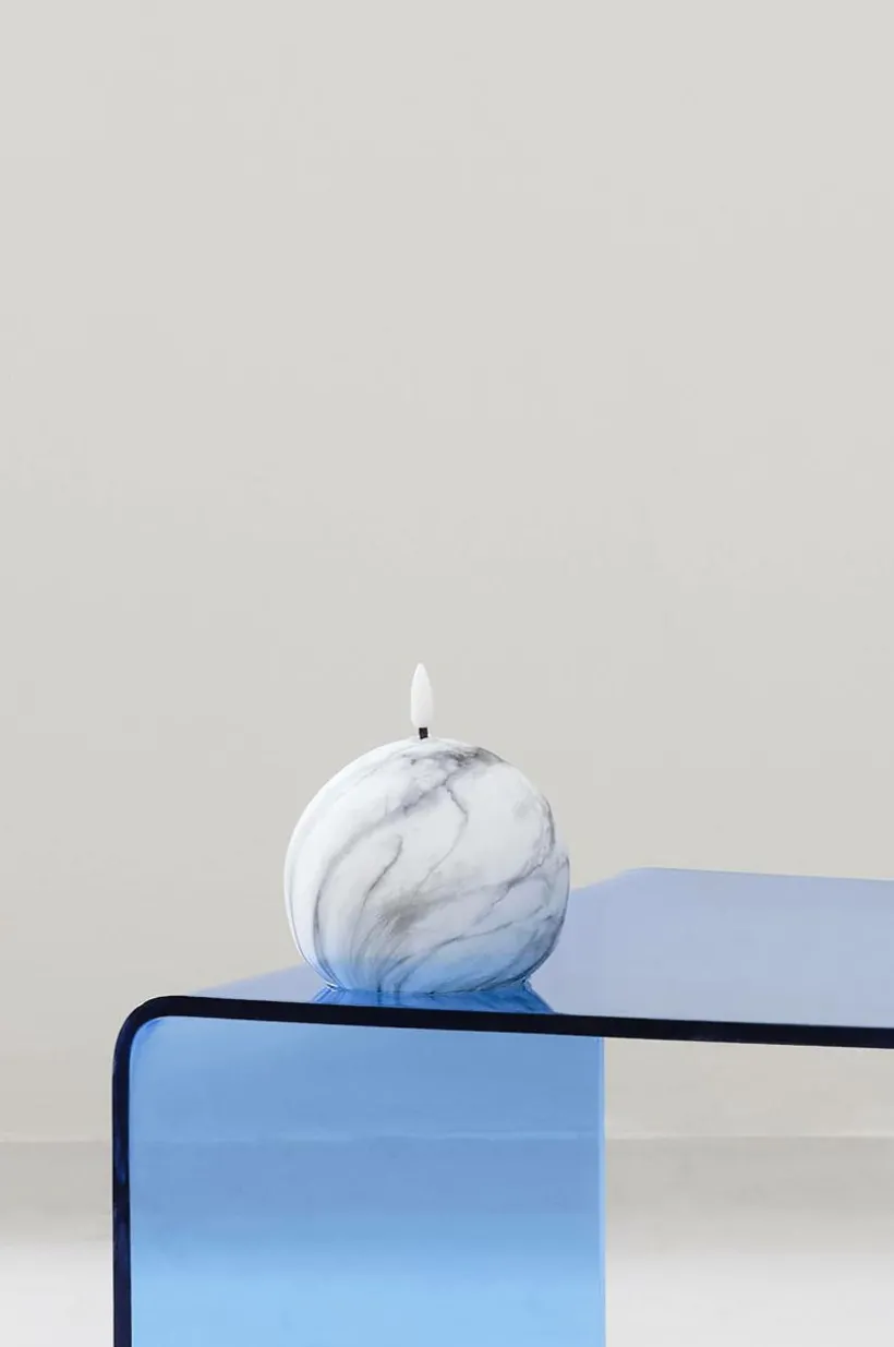 Klotformat ljus av betong med naturtroget marmormönster. Ljuset är batteridrivet och har LED-belysning, så det är helt brandsäker. Den naturtrogna lågan har ett varmvitt sken. Timerfunktion gör det enkelt att ställa in när det ska lysa, intervallet är 6 timmar på och 18 timmar av, repeterande. Batterifack och låga är av plast. För inomhusbruk.