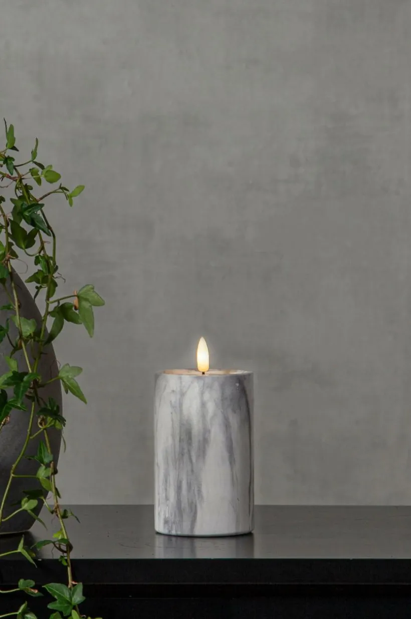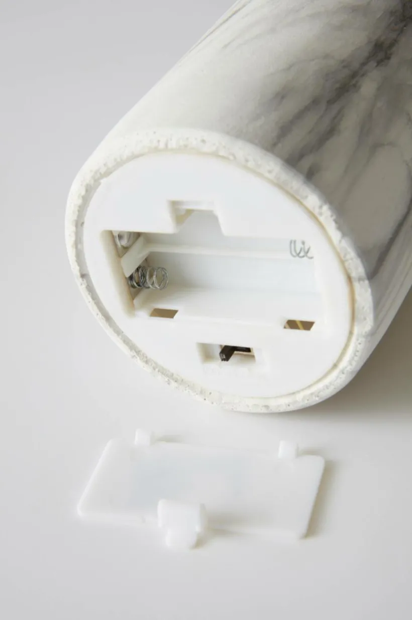 Ljus av betong med naturtroget marmormönster. Ljuset är batteridrivet och har LED-belysning, så det är helt brandsäker. Den naturtrogna lågan har ett varmvitt sken. Timerfunktion gör det enkelt att ställa in när det ska lysa, intervallet är 6 timmar på och 18 timmar av, repeterande. Batterifack och låga är av plast. För inomhusbruk.