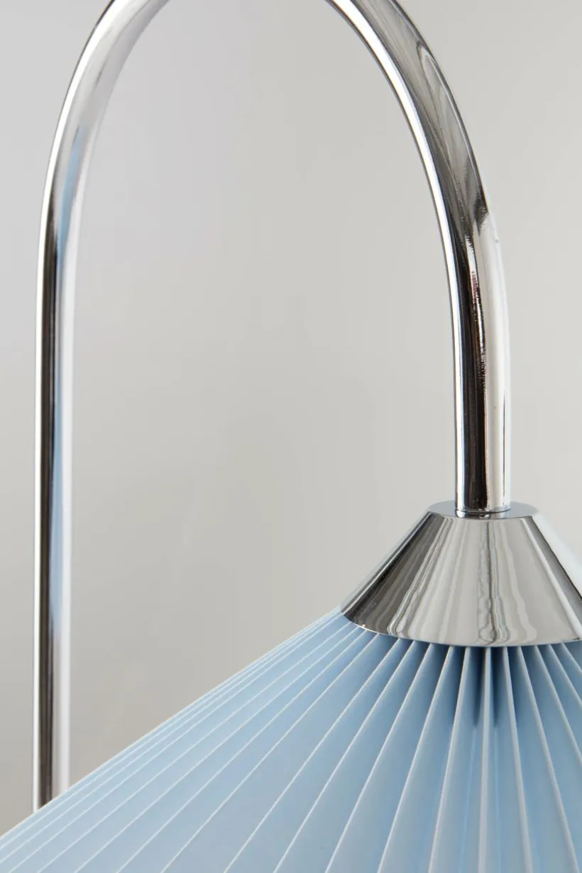 Golvlampan FLORENCE har kromad, stilren metallfot som matchas fint av en veckad textilskärm. Böjningen upptill på foten ger lampan en mjukare känsla som står i snygg kontrast till kromfärgen. Skärmen har diskret metallstomme och kromad topp. Svart sladd med strömbrytare på sladden.