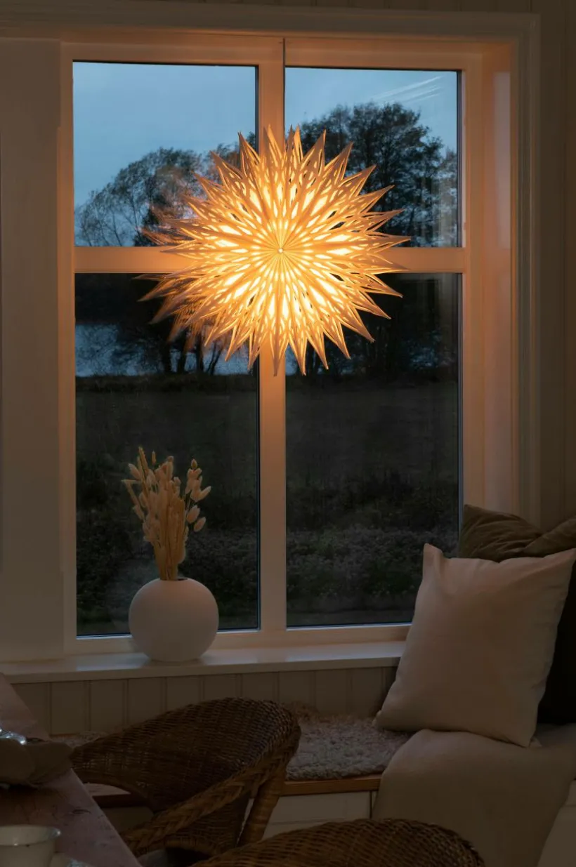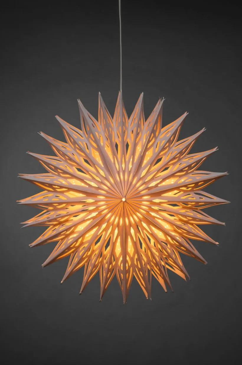 Ljusstjärna i pappershantverk vackert formad som en blomma. Inklusive ett praktiskt 5 meter långt sladdstativ för enkel placering. Idealisk för advents- och juldekorationer, perfekt att hänga i fönster eller mot väggar, vilket ger värme och charm till alla miljöer.