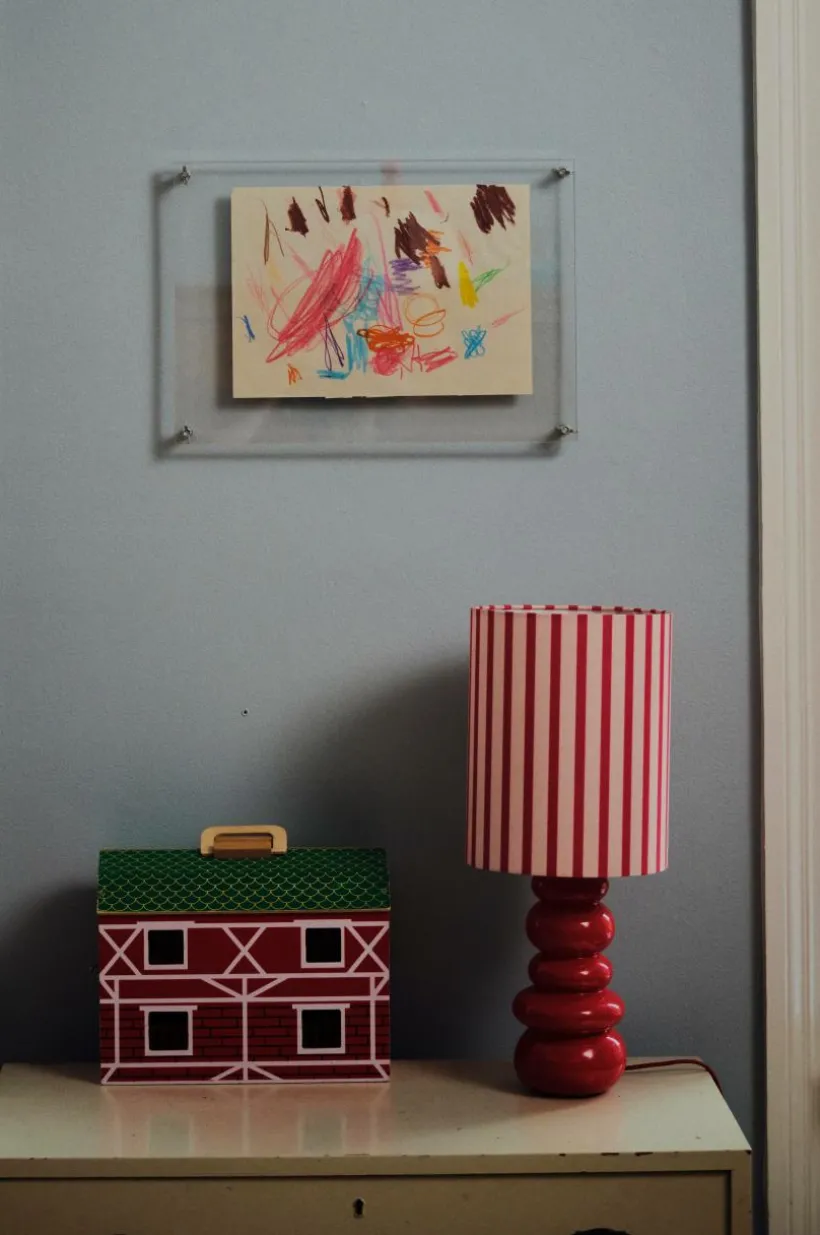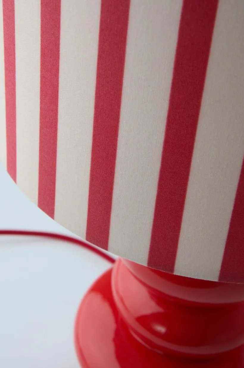Bordslampan FONSO har en blank keramikfot och sticker ut som en effektfull inredningsdetalj. Lampskärmen har tryckta ränder som ger en lekfull touch till ditt vardagsrum. Lampan kompletteras med en matchande textilkabel och kombinerar modern design med tidlös stil, vilket ger både funktionalitet och charm. Lys upp ditt hem med den fängslande bordslampan FONSO.