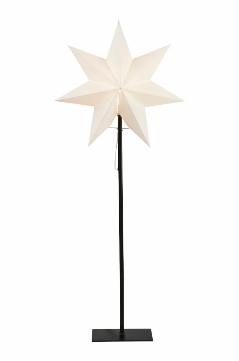 Stjärna på fot med svart textilkabel. Elegant stjärna att dekorera med i hemmet. Stjärnan har plats för en ljuskälla. Ljuskällan ingår ej. E14 sockel. Djup:15cm, höjd:85cm, bredd:35cm.