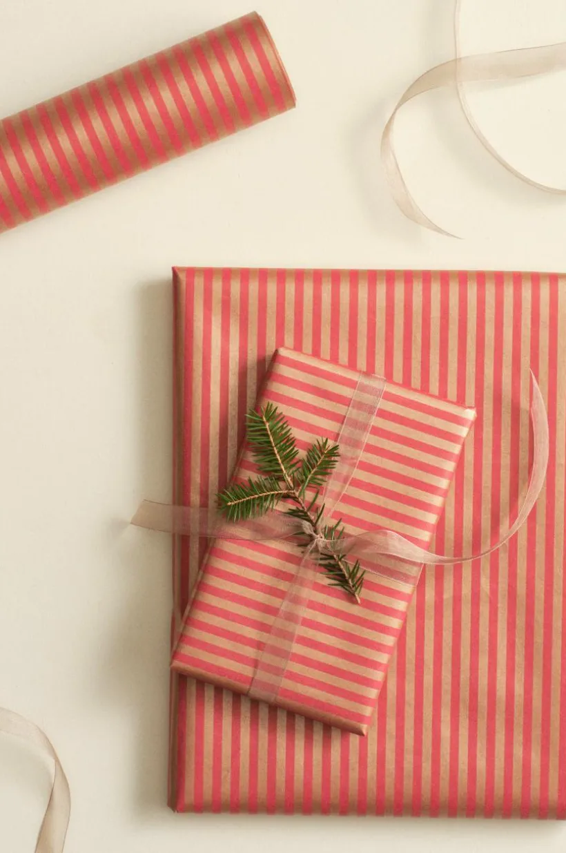 Randigt presentpapper av FSC-certifierat papper. Pappret har tryckta ljusa ränder på ena sidan och den andra sidan är enfärgad i den mörkare nyansen. Med presentpappret GEORGIA kan du alltså göra både enfärgade och randiga presenter och få härlig variation. Tillverkat i Sverige. Ytvikt 80 g/m².