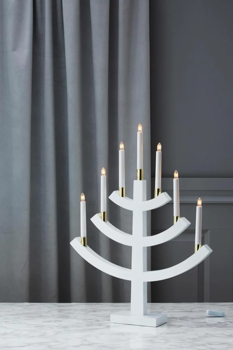 Sjuarmad elljusstake i trä med mässingbelagda ljushållare. Glödlampor medföljer.