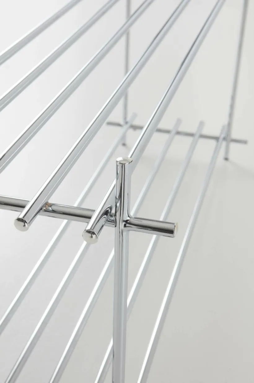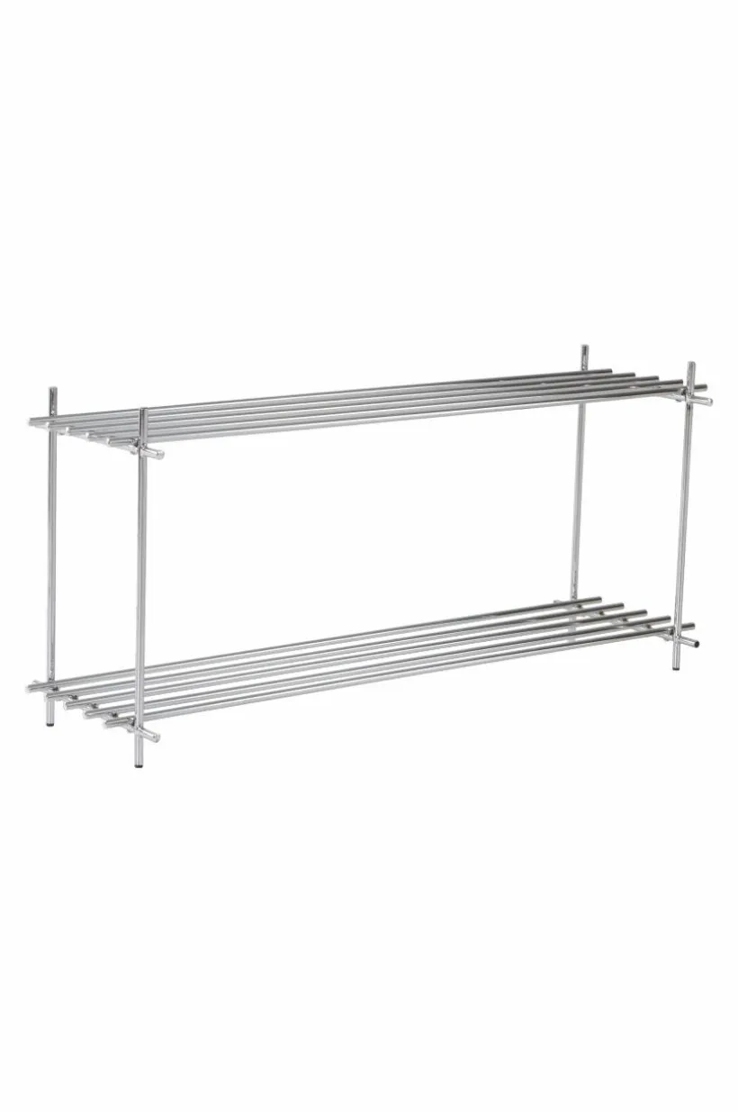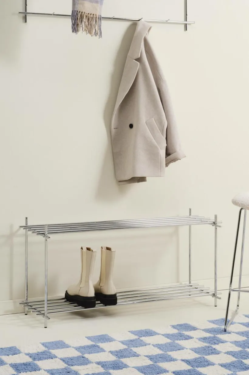 GLAZE är en minimalistisk hallserie för stilren förvaring vid din entré. Skohyllan är tillverkad av järnrör med kromad plätering som ger en högblank yta. Skohyllan har två hyllor för skor.