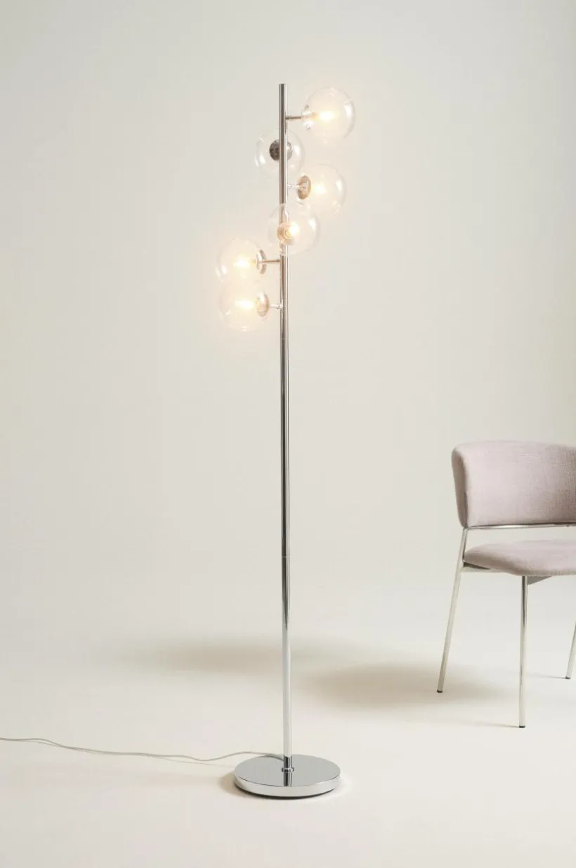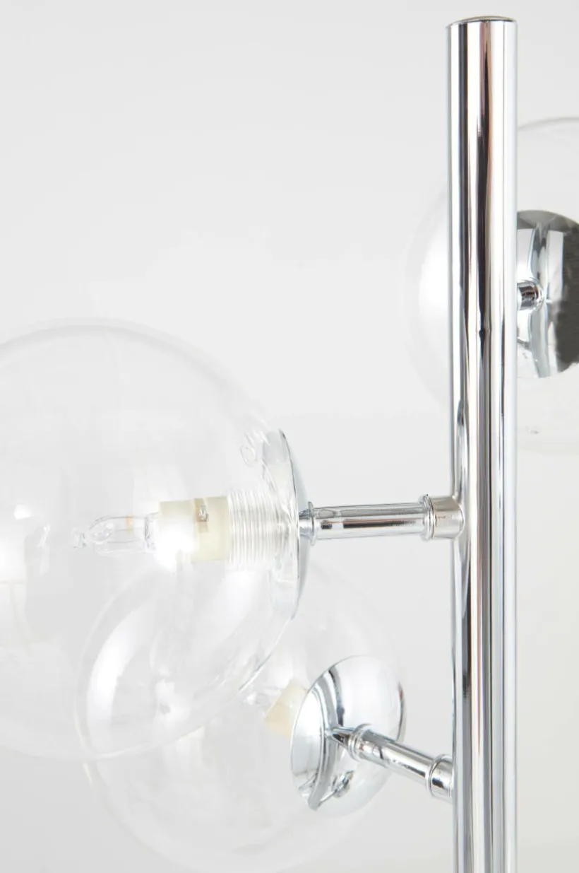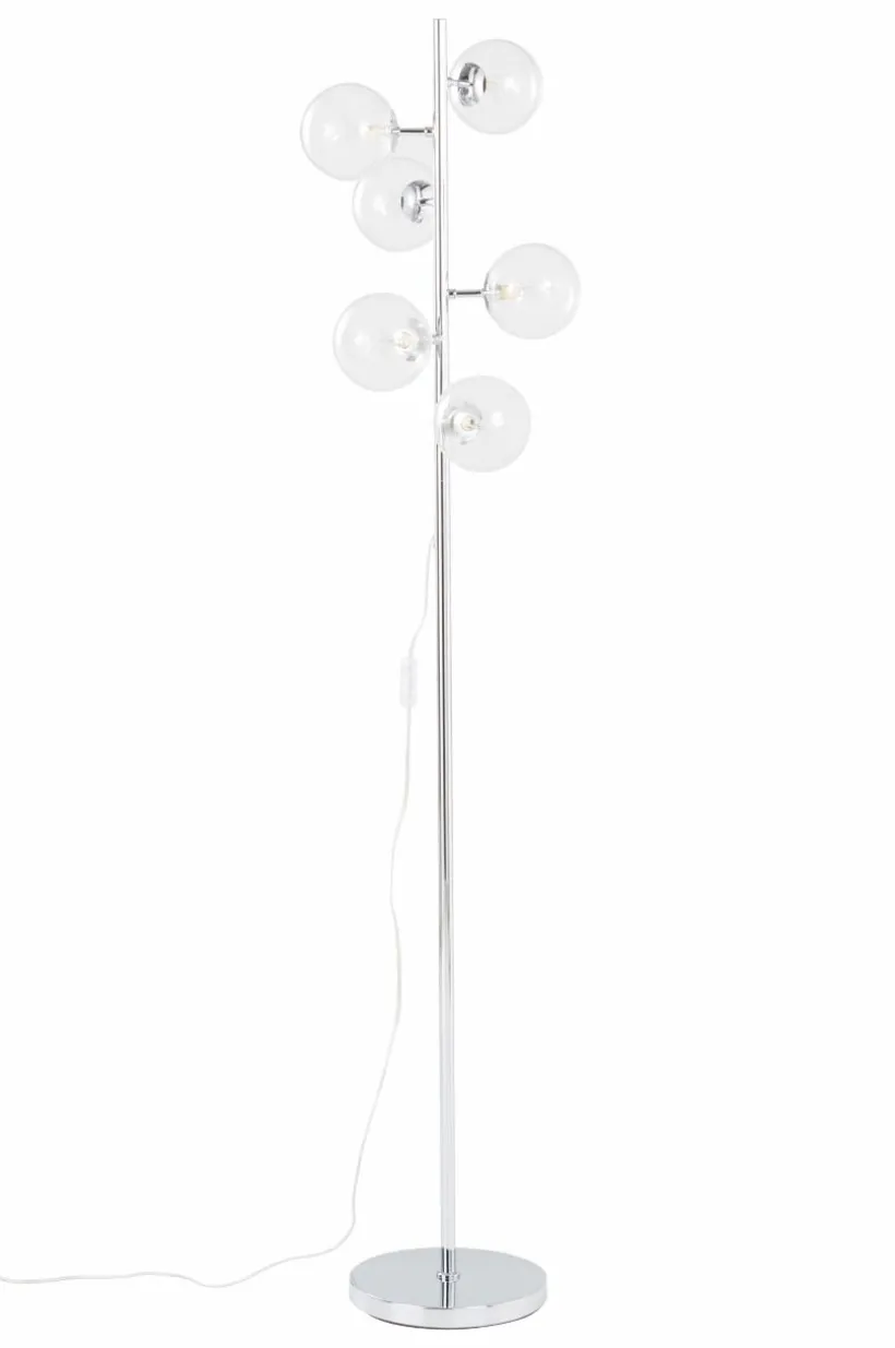 Lyxig golvlampa med fot i kromfärgad metall och sex glaskupor i klarglas. Den snygga golvlampan sprider ljuset i alla riktningar och är både dekorativ och praktisk som ljuskälla i ett rum. Lampan har transparent plastsladd med strömbrytare på sladden.