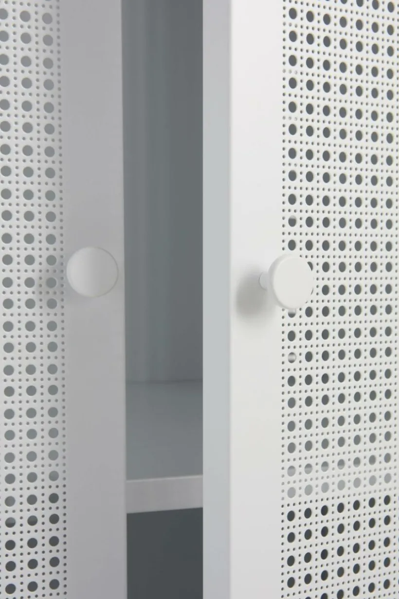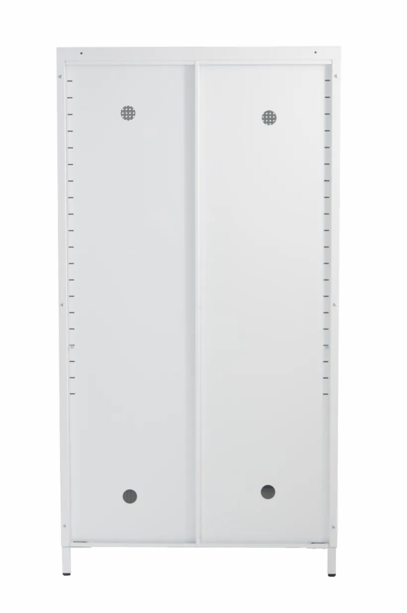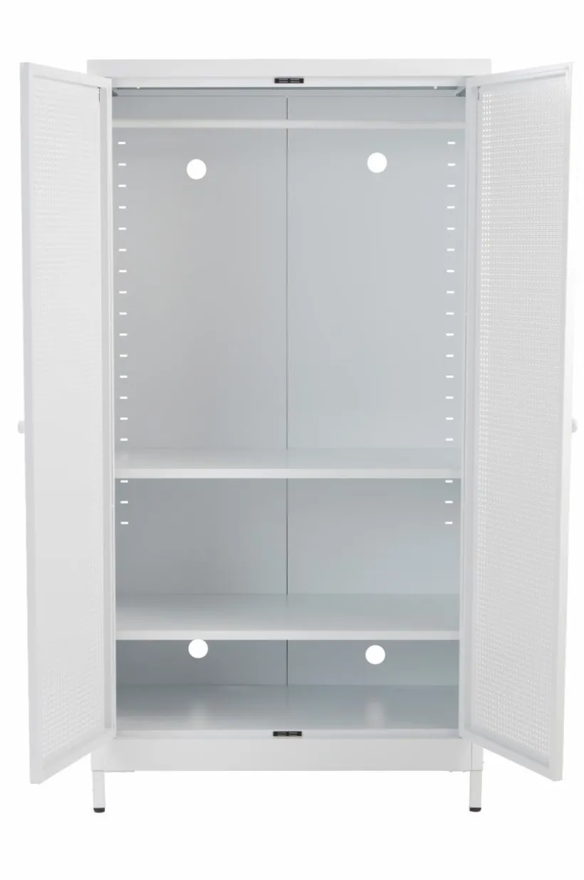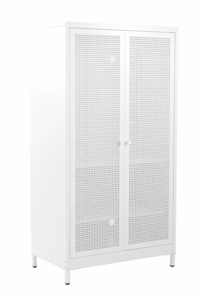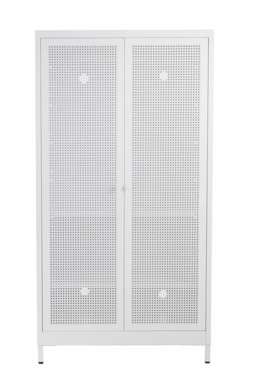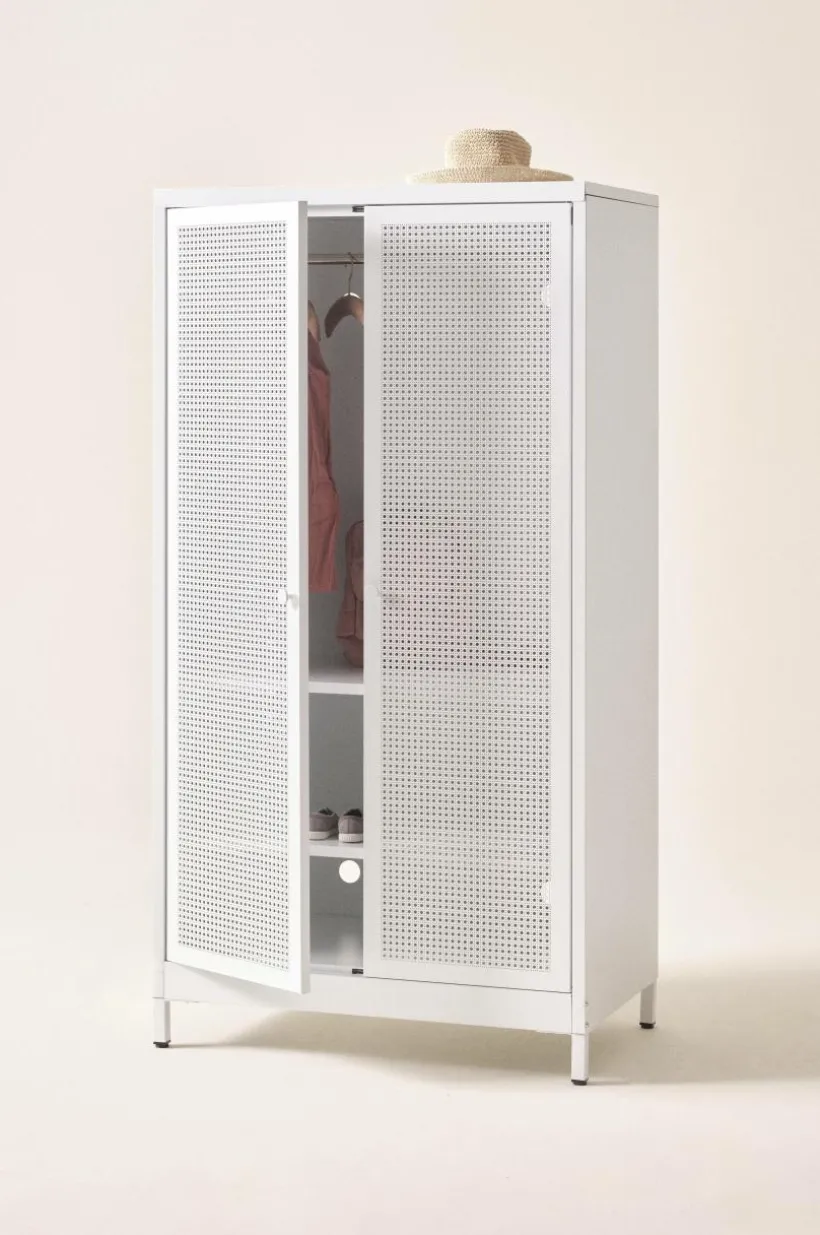 Barngarderob i pulverlackerad metall. Dörrarna har perforerat mönster som ger rottingkänsla trots att även de är av tålig metall. Invändigt har garderoben en klädstång och två flyttbara hyllplan. Av säkerhetsskäl ska skåpet monteras mot vägg så att det inte kan välta. Väggfäste ingår. Viss montering krävs. Monteringsanvisning medföljer.