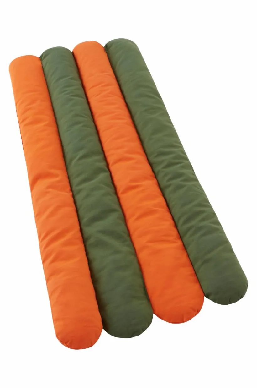 Färgglad strandmadrass för barn. Strandmadrassen är tvåfärgad i vävt yttertyg av bomullscanvas med mjuk fyllning av polyester. Madrassen är kanalsydd så att fyllningen sitter på plats. Med praktisk bärrem är den enkel att ta med till stranden eller ut i trädgården. Ihoprullad stängs den med knytband med kardborre.