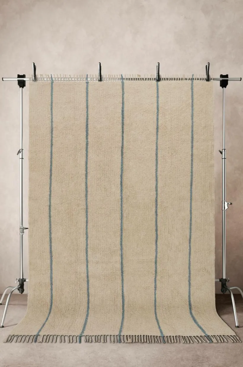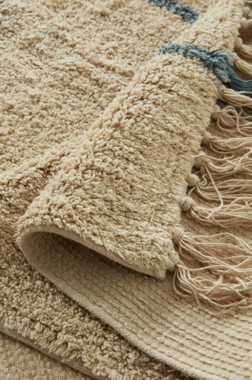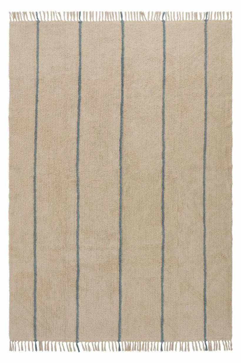 Tuftad matta av bomull med mjuk lugg. Mattan har garnfärgat randmönster som ger ett fräscht och klassiskt uttryck vilket gör den lätt att placera i olika rum. Franslängd 10 cm. Lugghöjd 1 cm. Tjocklek 1,1 cm. 1400 g/m².