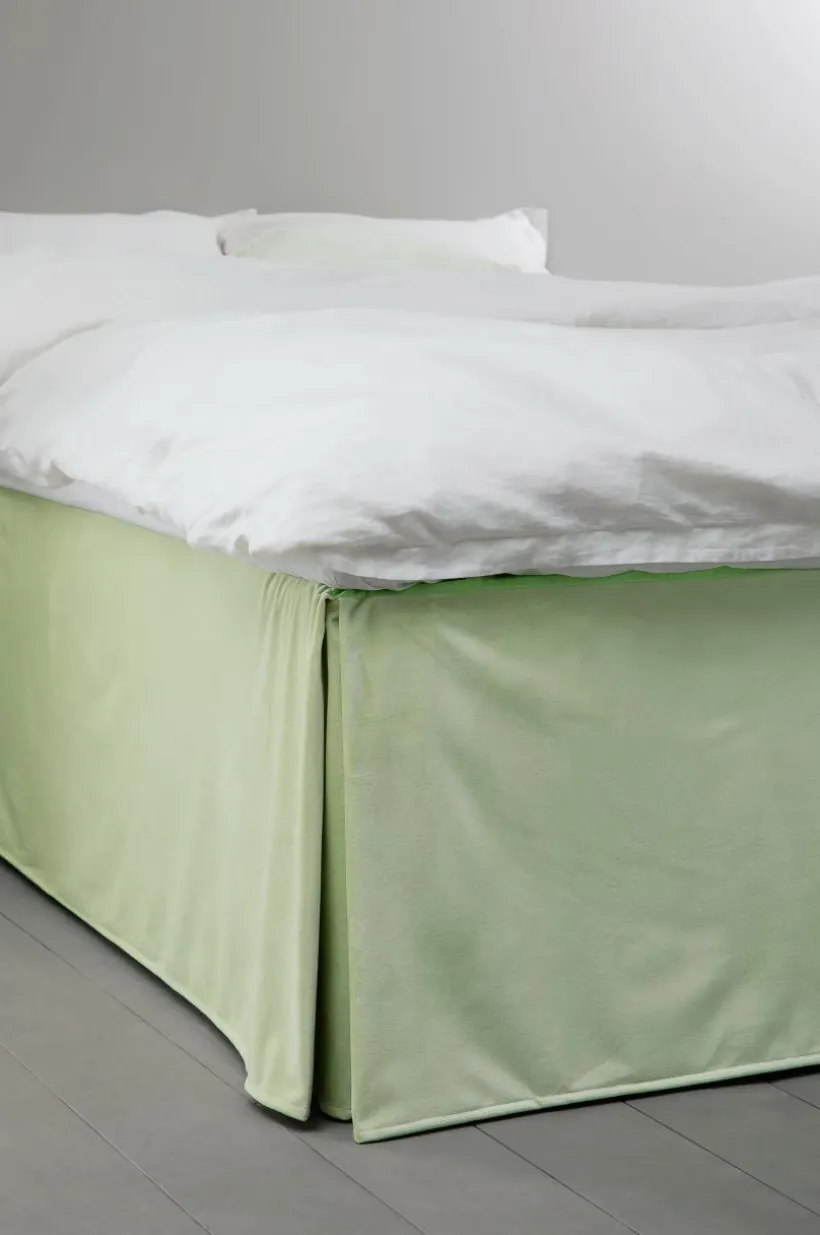 Enfärgad sängkappa med kjol i sammet på tre sidor och platta av bomull.