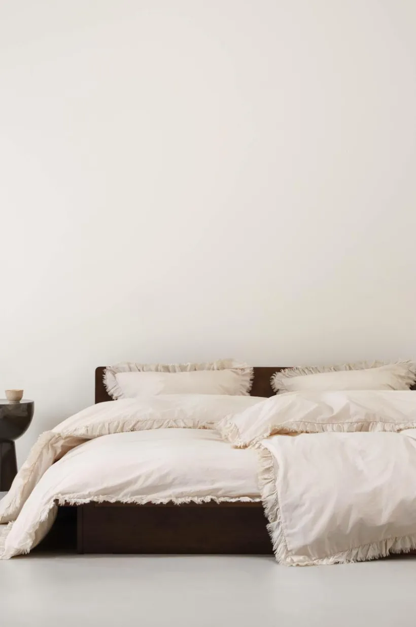 Påslakanset i två delar, ett påslakan och ett örngott av tvättad bomull med mjuk känsla. Bomull är behagligt att bädda med och upplevs svalt och skönt mot huden. JINN har en lätt fransig volangkant runt om. Tryckknappar för tillslutning i öppningen på påslakanet. Trådtäthet på 144 tc. (Trådtätheten talar om antalet trådar, thread counts, per kvadrattum i ett tyg. Ju högre trådtäthet desto högre kvalité.)