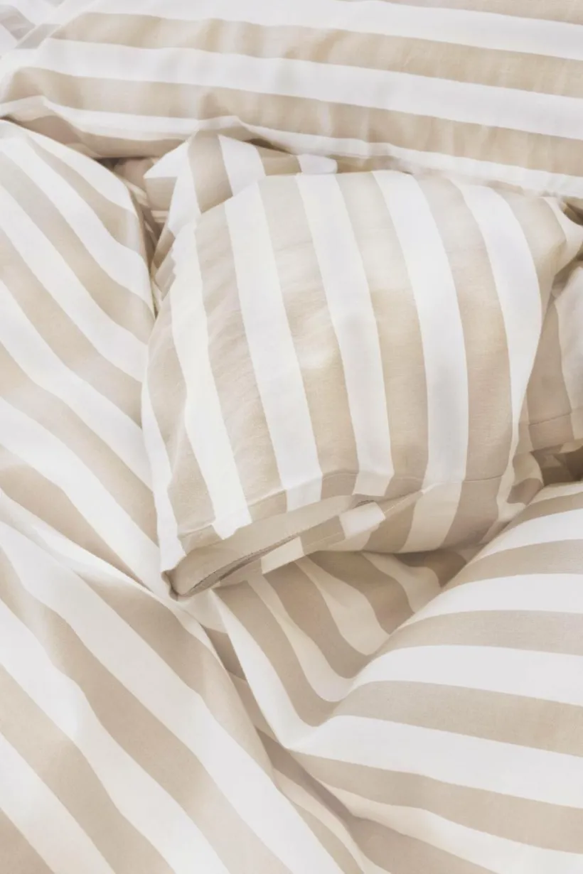 Randigt påslakanset i tre delar, ett extra brett påslakan och två örngott av bomull. Den tvärgående randningen är tryckt i fräscha, somriga färger och på båda sidor av örngott och påslakan. Bomull är en mjuk och behaglig kvalité som känns sval mot huden.