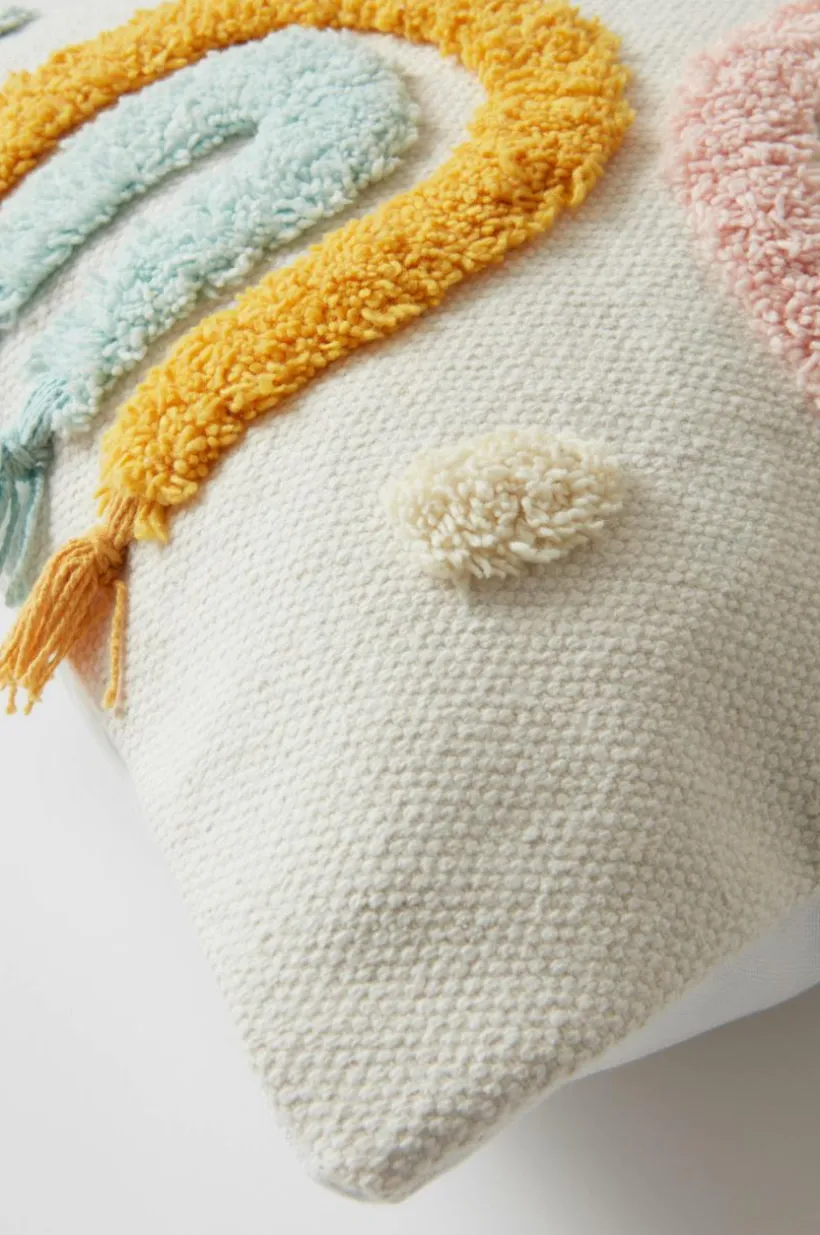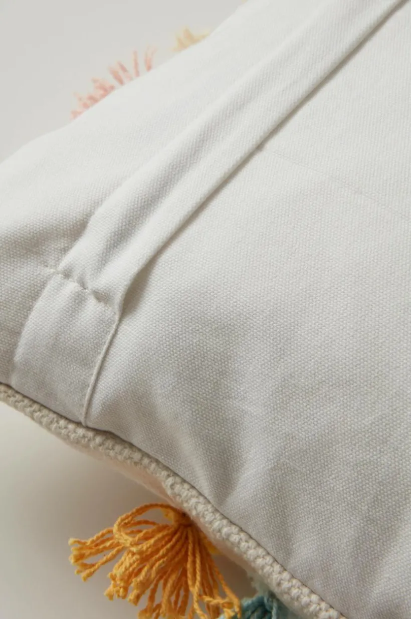 1-pack kuddfodral i lite grövre, ekologiskt bomullstyg med tuftat mönster i mjukt garn som går i milda pasteller. Bågarna avslutas med små tofsar. Enfärgad baksida med dold dragkedja.