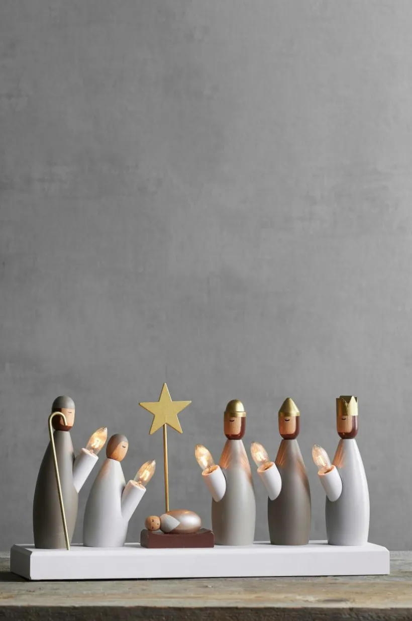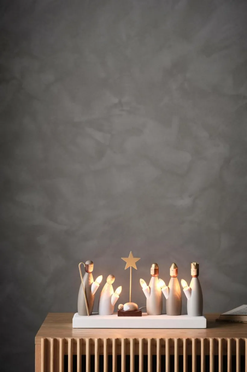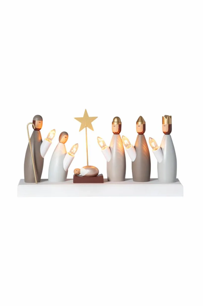 Träljusstake med de tre vise männen, Maria, Josef och Jesusbarnet som ligger på en bädd. Elljusstaken har en målad guldstav med en stjärna i metall och 5 ljuskällor. Ljusskällor ingår. Placera på en skänk eller i ett fönster för att sprida en härlig julstämning i ditt hem. Vit sladd, sladdlängd 1,8 m.