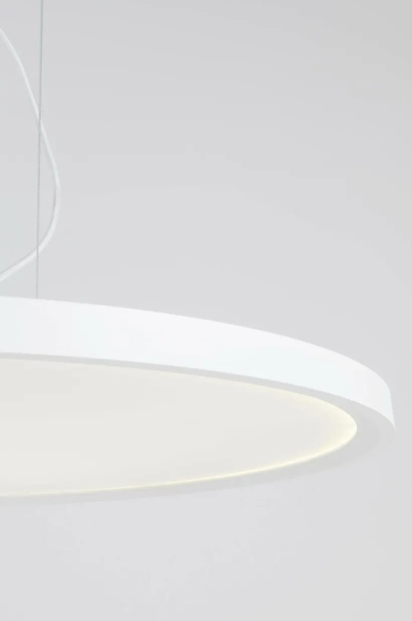 Taklampa av aluminium och opalglas med dimbar LED-belysning. Opalglasskivan har en tunn metallram runtom och lampan ger en sofistikerad belysning som får perfekt ljusstyrka med hjälp av dimmer. Upphängningen består av tre vajrar som är 1,2 m vardera, längden kan justeras. Den vita sladden är längre än vajrarna och sladden formas dekorativt och fästs vid en vajer. Lampan är jordad. Takplugg ingår ej p.g.a. EU-regler. Den finns att köpa separat och heter ROOF EARTH takplugg.