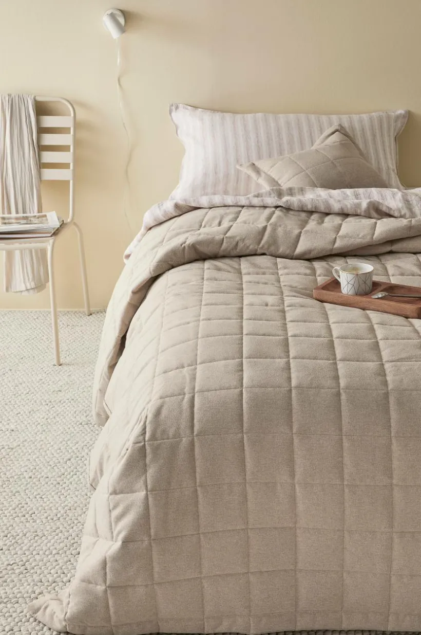 Enfärgat överkast för enkelsäng i mjuk polyester med fin struktur som ger en härlig linnekänsla. LINDEN överkast är quiltat i dekorativa fyrkanter. Fyllning av polyester 80 g/m².