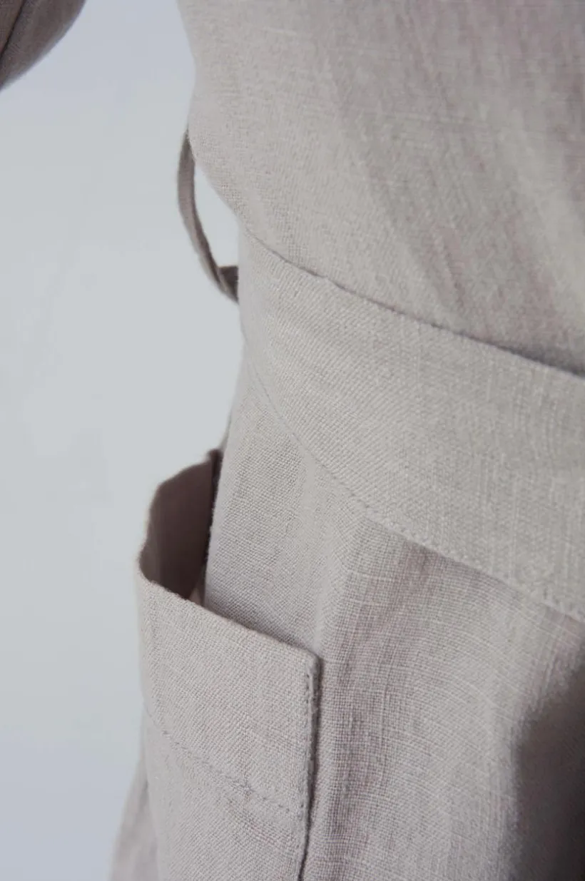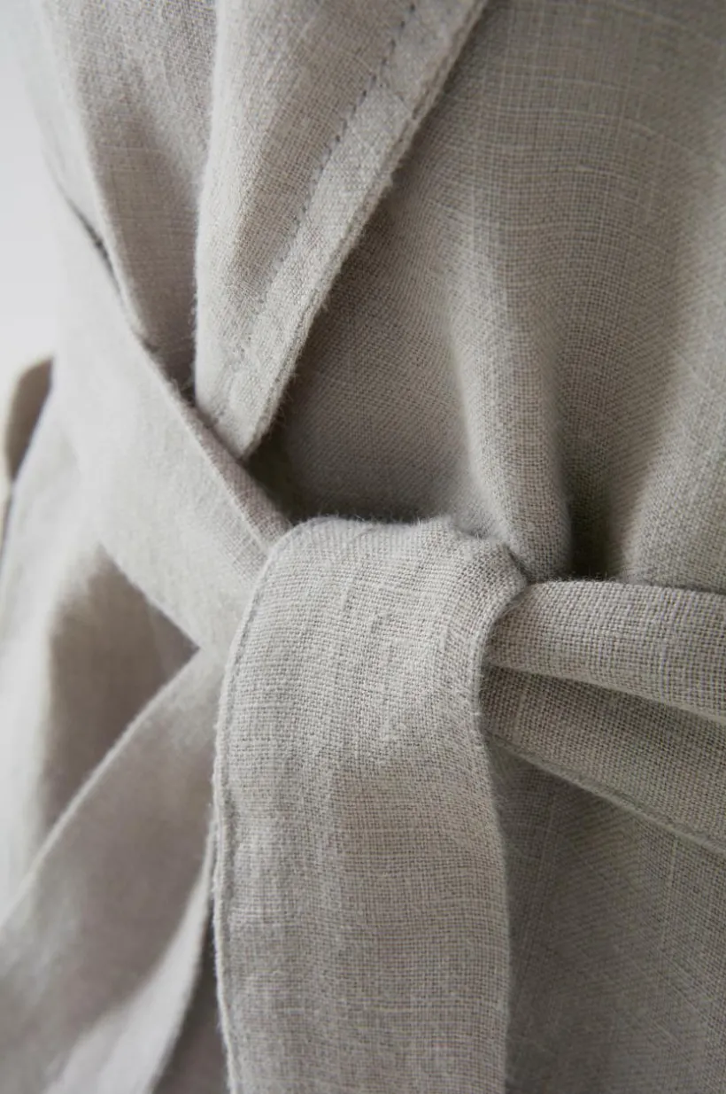 Badrock av naturligt och behagligt linne. Den sköna linnekvalitén har tvättats för att bli härligt mjuk och skön. Mysig modell knytskärp i midjan och två framfickor. Vikt 160 g/m².