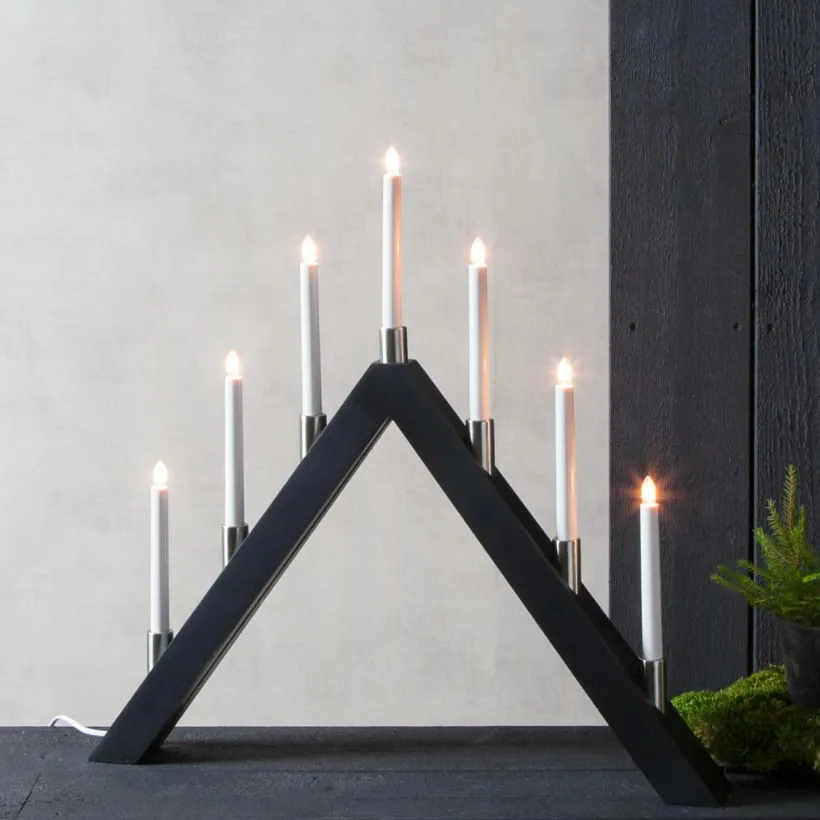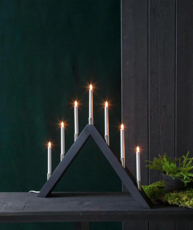 Vit 7-armad träljusstake med dekorativa ljushållare. En vacker adventsljusstake som sprider julstämning i hemmet. E10-sockel, ljuskällan är 34V/3W.