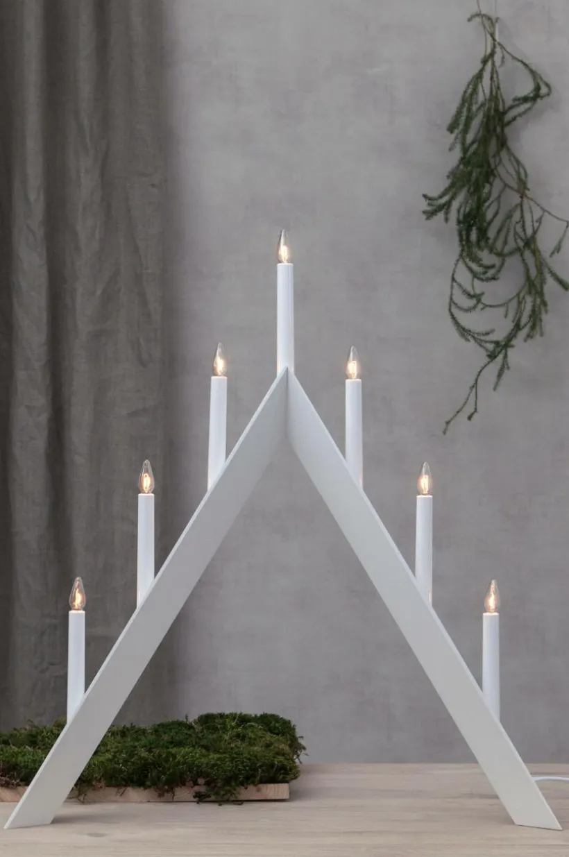 Elegant högre träljusstake med en häftig form. Levereras tillsammans med stilrena ljuskällor. Höjd 64,5 cm, bredd 60 cm, djup 7 cm. Sockel E10. Sladdlängd 180 cm.