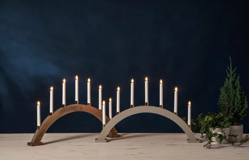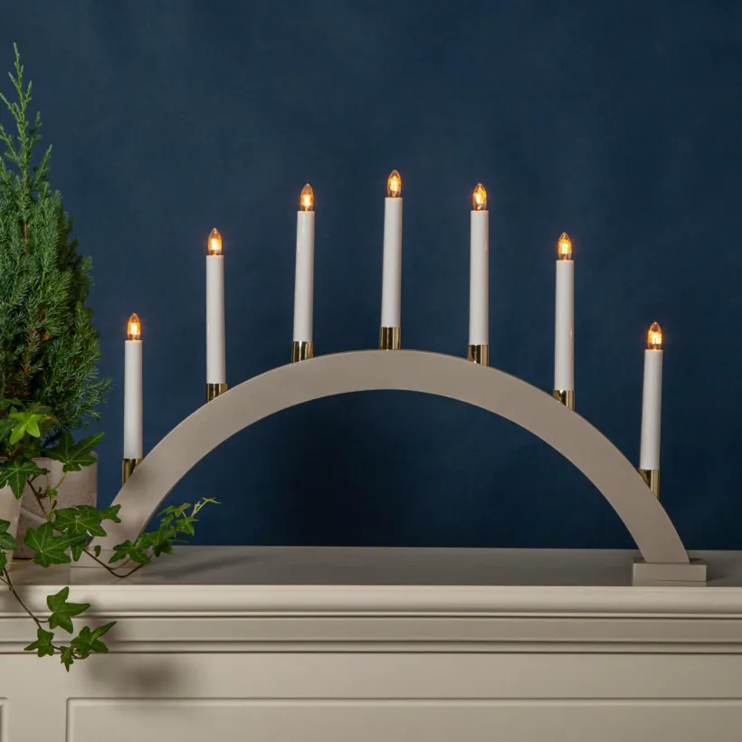 Beige bågformad träljusstake med mässing belagda ljushållare. Fin adventsljusstake att dekorera med till jul. Ljusstaken har 7 ljuskällor.