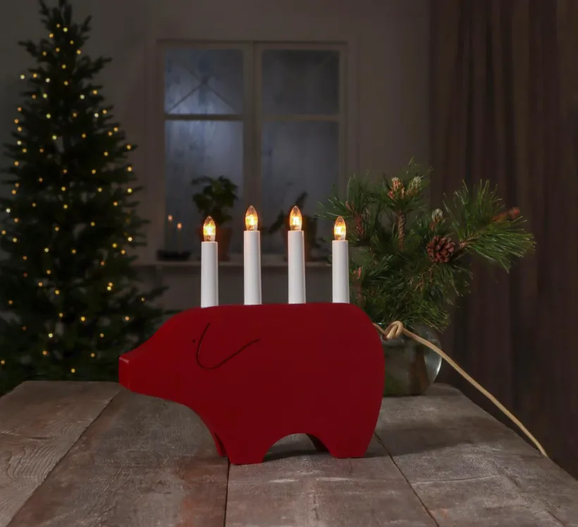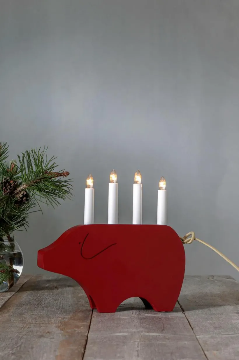 Adventsljusstake i form av en vit julgris, tillverkad i trä. Textilkabel med brytare. Placera den i ett fönster eller och på en skänk. Härlig adventljusstake att dekorera med till jul.