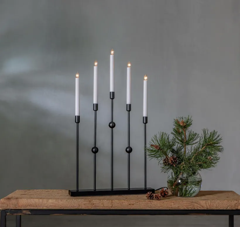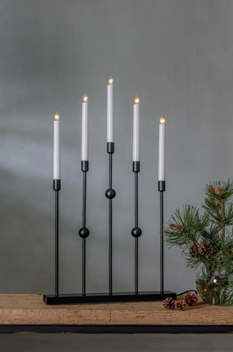 Stilren adventsljusstake i metall. Färgen är mässings. Ljusstaken har 5 ljuskällor med mysigt sken. Placera i ett fönster eller på en skänk, passar utmärkt till advent och jul.