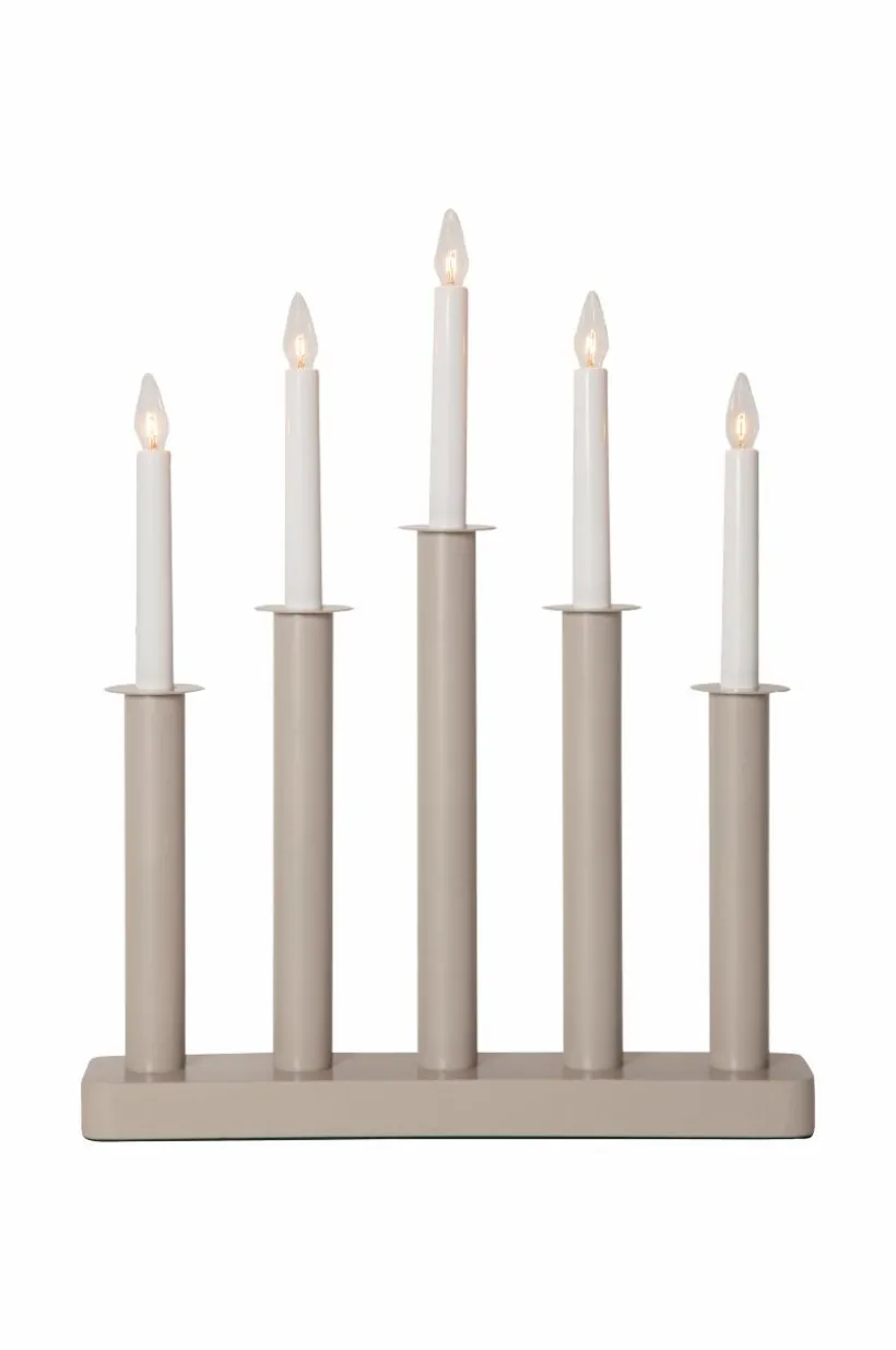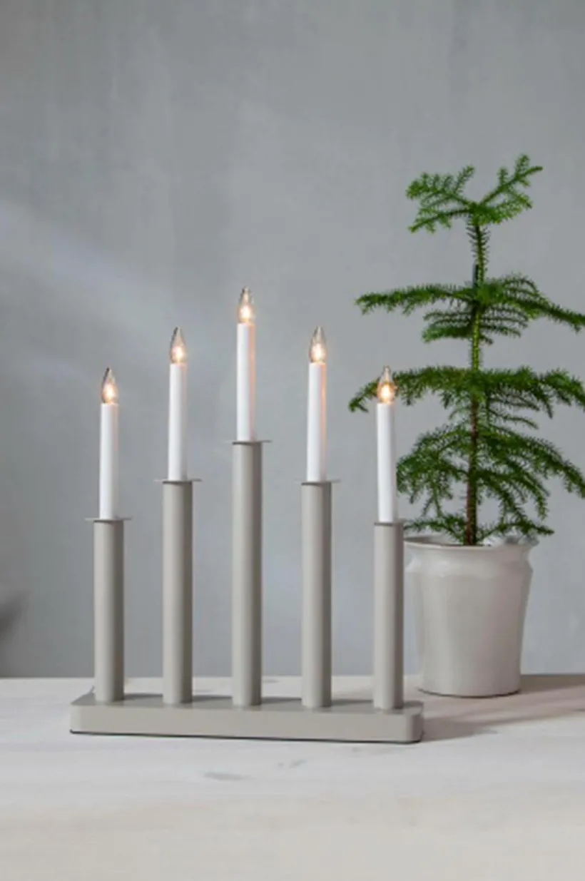 Modern vit adventsljusstake tillverkad i trä med matchande metall dekoration. Dekorera med till advent och jul, placera den i ett fönster eller på en skänk.