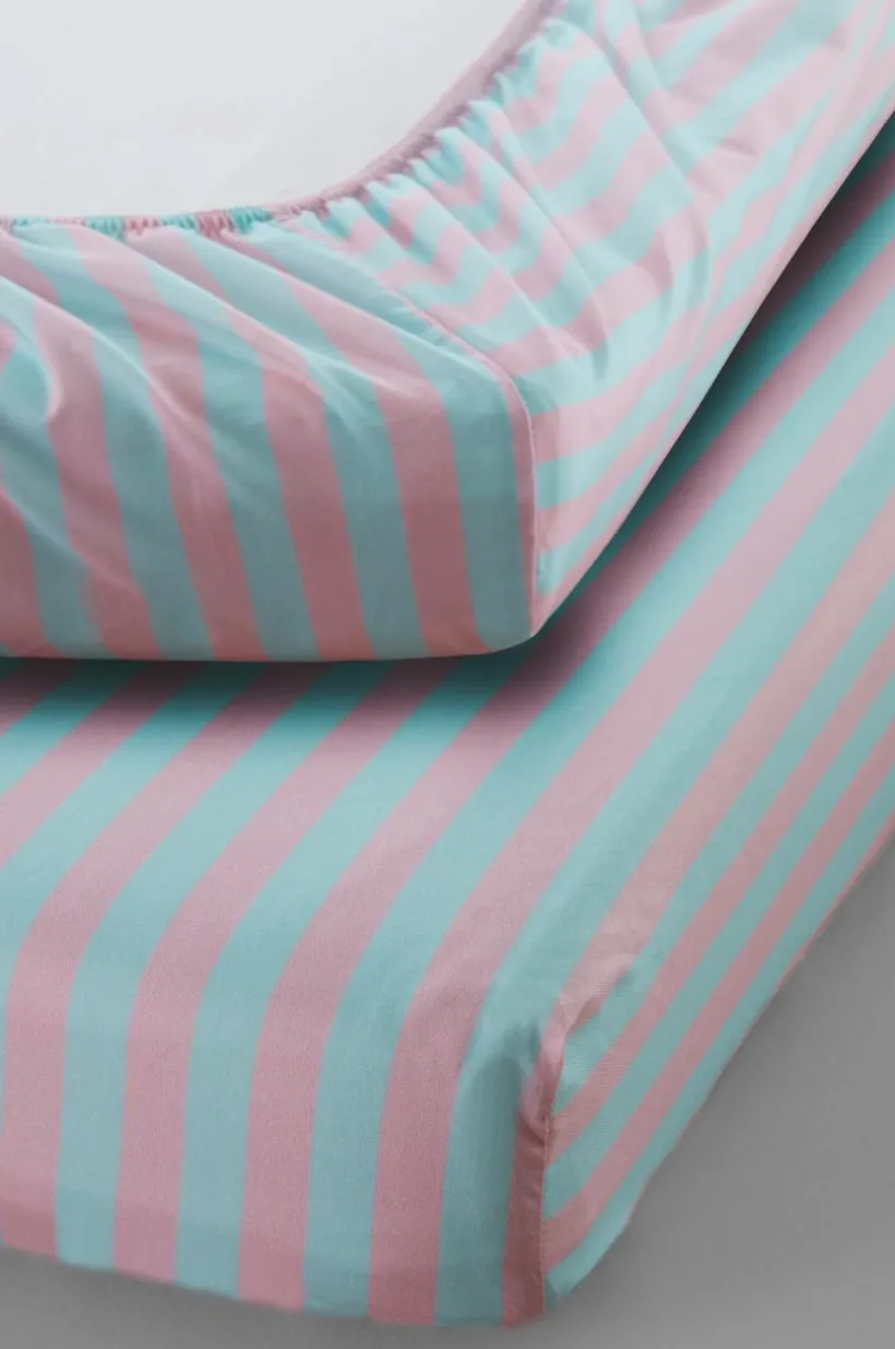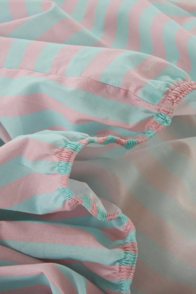 Dra-på-lakan av ekologisk bomull med resår i hörnen. Den elastiska kanten gör att lakanet sitter bra på madrassen. Blockrandigt mönstertryck gör sovrummet fräscht och att sova i ekologisk bomull känns svalt och skönt mot huden. Dra-på-lakanet är dessutom plaggtvättat vilket innebär att det tvättats efter sömnad och känslan blir extra mjuk och skön. Trådtäthet på 144 tc. (Trådtätheten talar om antalet trådar, thread counts, per kvadrattum i ett tyg. Ju högre trådtäthet desto högre kvalité).
