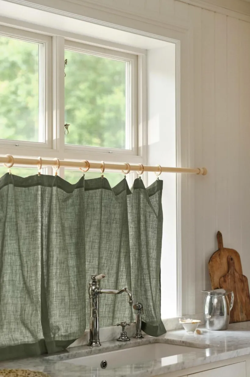 En cafégardin i luftigt tyg med melerad effekt. Tyget är vävt i bomull och har en skönt avslappnad känsla. Cafégardinen LUNI har en sydd kanal upptill och den hängs på gardinstång nedtill i ditt fönster och ger på så sätt insynsskydd samtidigt som ljuset kommer in ovanför gardinen, härligt att alltid se himlen.